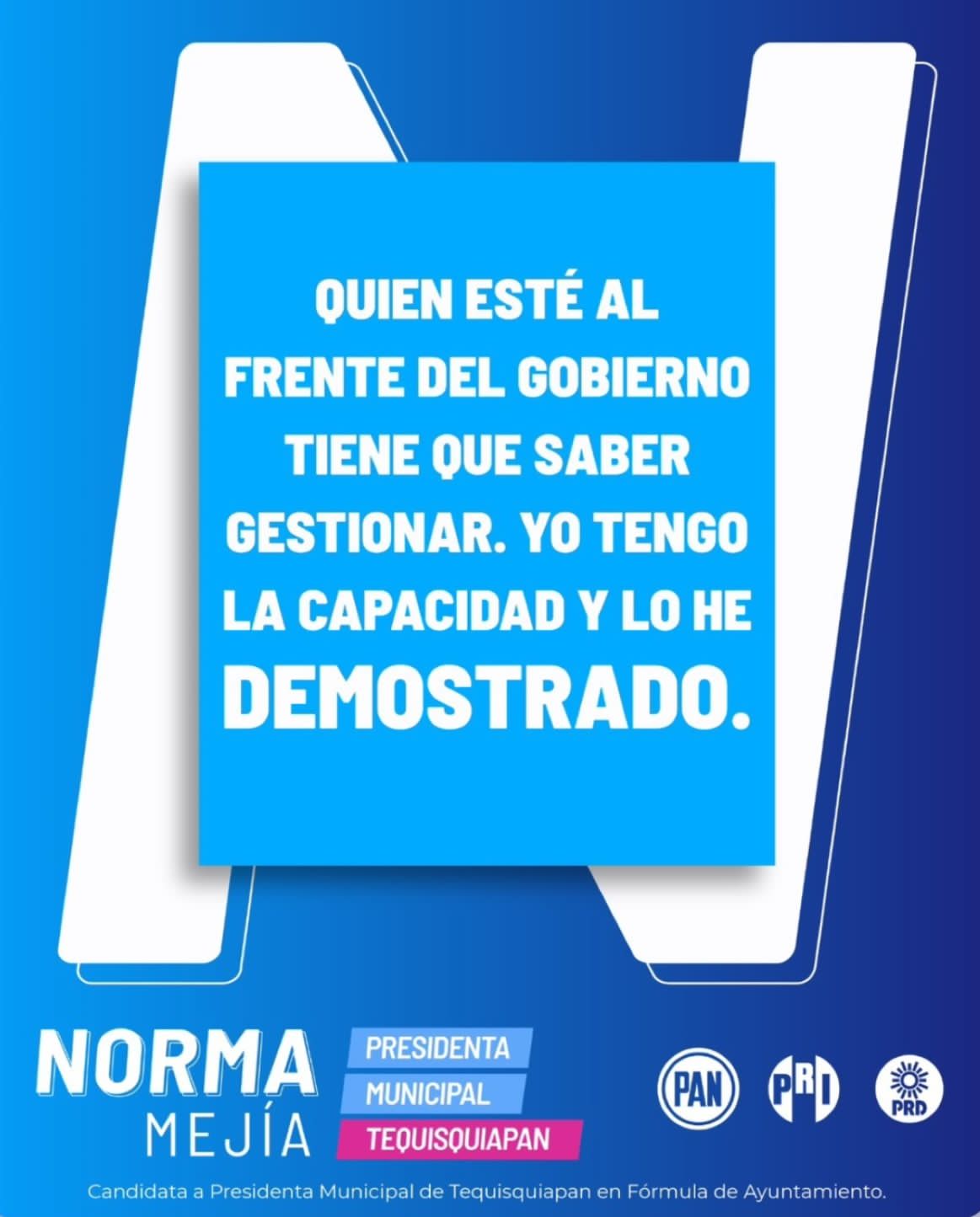 “Hoy Tequis está avanzando, no detengamos lo ganado. No permitamos que vengan personas a jugar con tu presente y tu futuro, que cuando pudieron trabajar por el Pueblo, no lo hicieron. Tequisquiapan requiere de una persona que sí venga a trabajar, por eso este 2 de junio vota por el PAN, PRI y PRD, vota por Norma Mejía”.