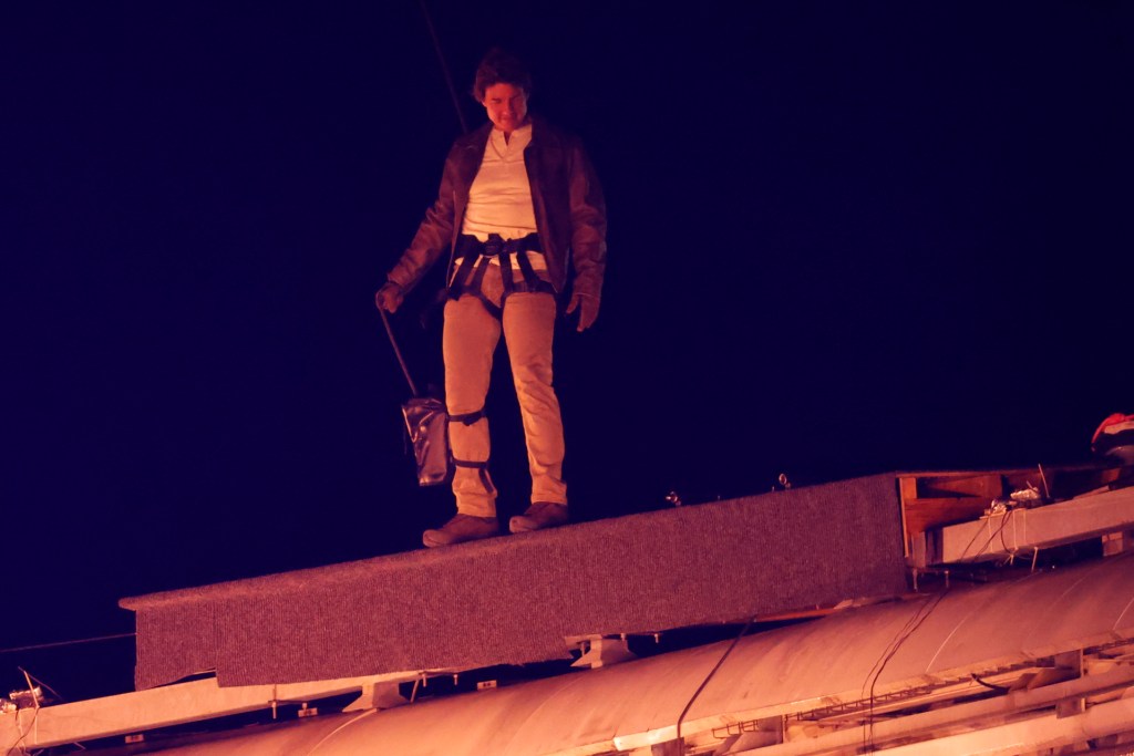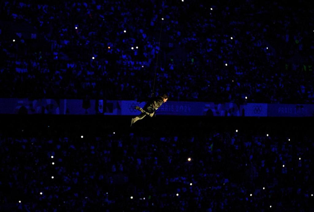 Desde la cima del Estadio de Francia, la estrella se descolgó hasta el escenario del estadio, del que después salió en moto para, en un vídeo, recorrer lugares emblemáticos de la capital francesa como la Torre Eiffel.