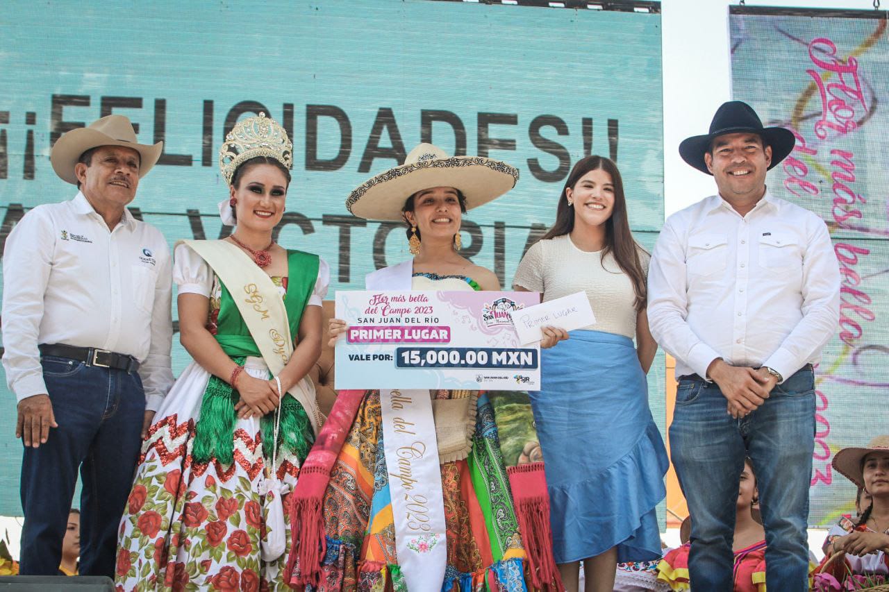 Como parte de las actividades de la Feria Nacional Ganadera San Juan del Río 2023, el presidente municipal sanjuanense, Roberto Cabrera Valencia, coronó con el sombrero de charro a Ana Victoria Estrella Chavero, de la comunidad Paso de Mata, al resultar ganadora en el certamen La Flor Más Bella del Campo.