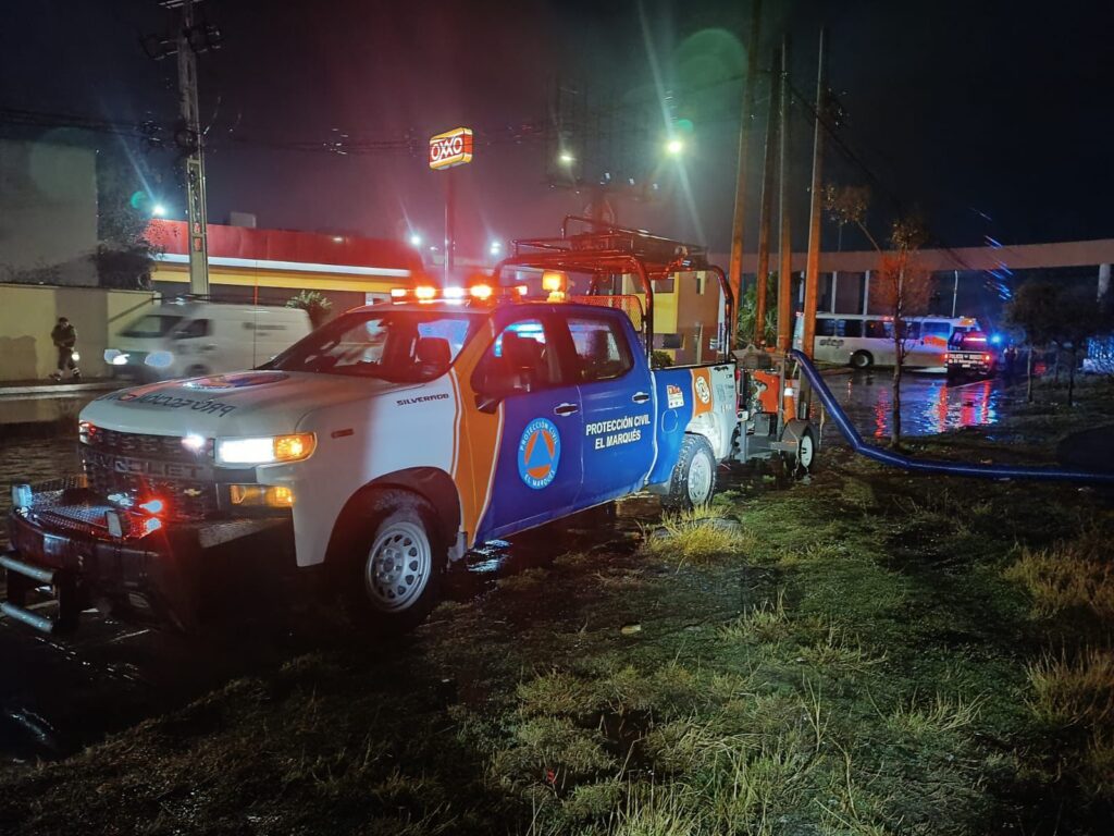 El acceso principal del fraccionamiento Paseos del Marqués presentó inundaciones, mismas que llegaron por encima de banqueta, impidiendo la circulación de vehículos por dicha vialidad, al lugar acudió Protección Civil en conjunto con la Secretaría de Seguridad Pública y Tránsito Municipal (SSPyTM) para ejecutar operaciones con bombas tragasólidos para redireccionamiento de agua y así reestablecer el tránsito por la zona.
