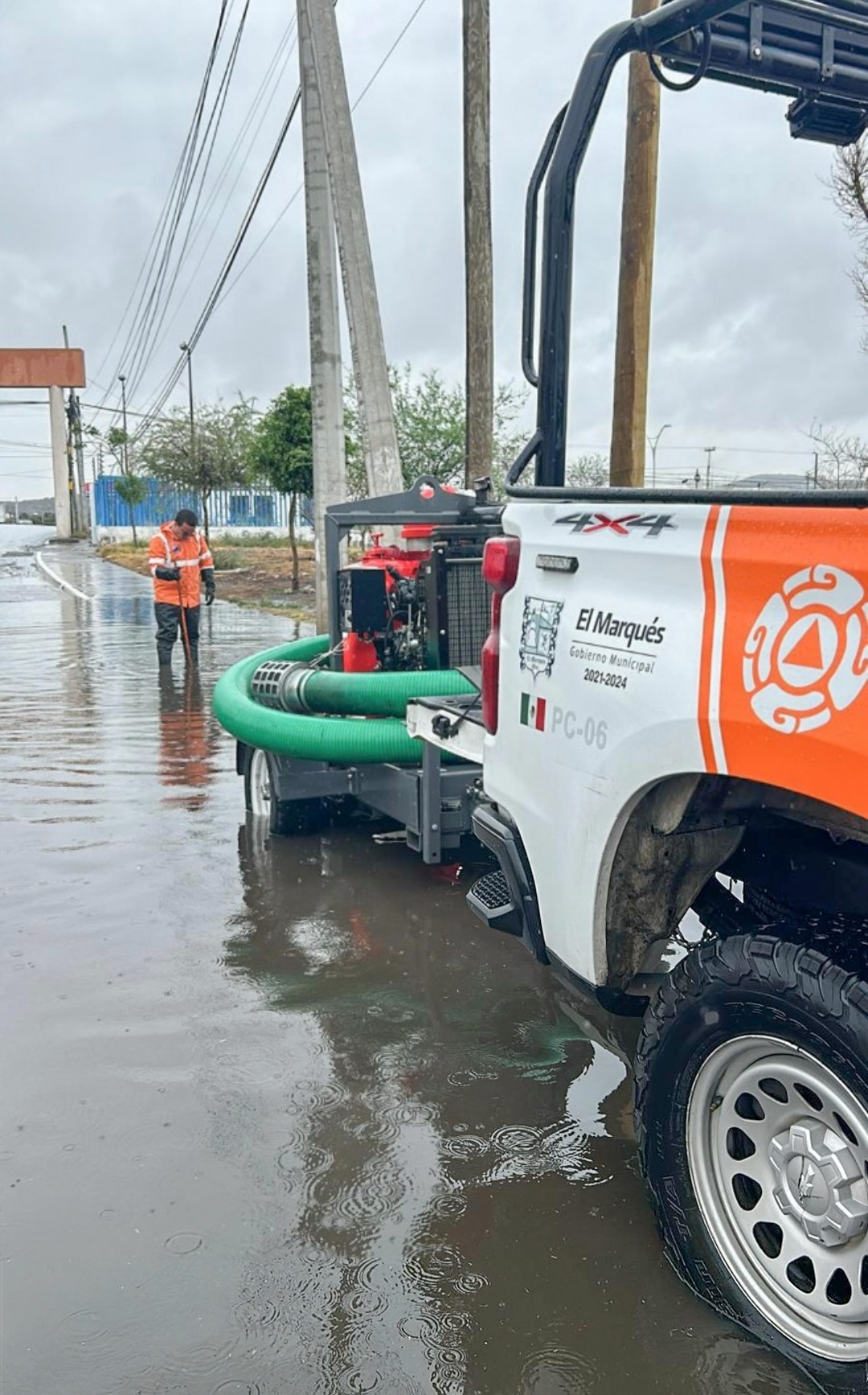 Por otra parte, en el fraccionamiento Paseos del Marqués se registró inundación en el acceso principal, por lo cual la Secretaría de Seguridad Pública y Tránsito Municipal (SSPyTM) y Protección Civil acudieron al lugar, y se llevaron a cabo operaciones con bomba tragasólidos para redireccionamiento de agua, y así liberar por completo la vialidad.