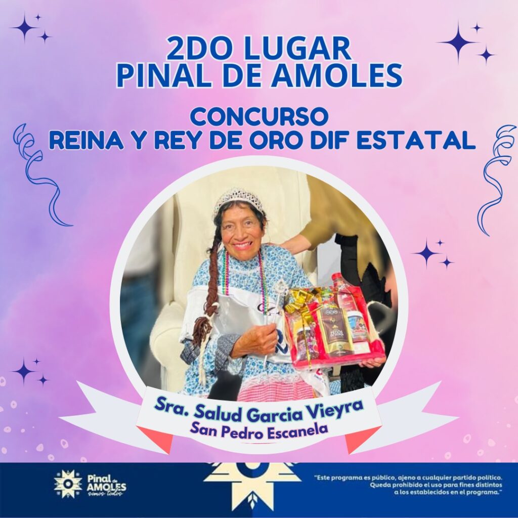 Muchas felicidades a la Sra. Salud García Vieyra de San Pedro Escanela por haber obtenido el Segundo Lugar en el Concurso Estatal Reina y Rey de Oro y al Sr. Juan Martínez García de Tonatico por su gran participación.