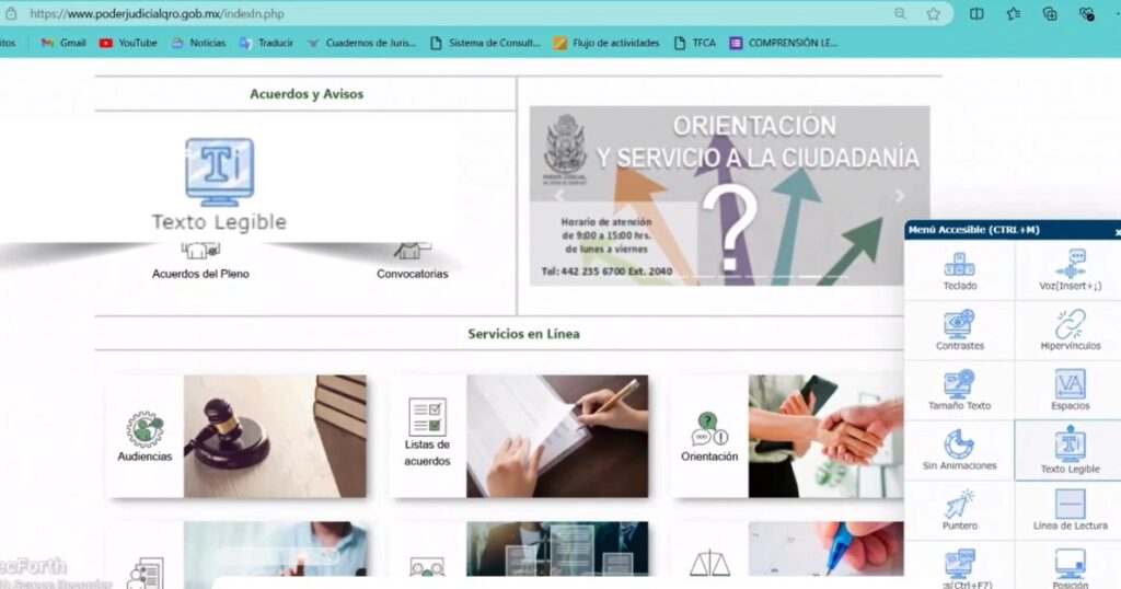Es importante mencionar que ofrece 12 funciones diseñadas para atender diferentes tipos de discapacidad, garantizando que las personas usuarias de los servicios de justicia puedan acceder y navegar en igualdad de condiciones, tales como contrastes para mejor legibilidad, facilitación en la detección de enlaces, aumento de tamaño de texto, incremento de espacios entre caracteres, cambio de tipografía, mejorar la visibilidad del cursor en la pantalla, y visualización de una barra guía durante la lectura, entre otras.