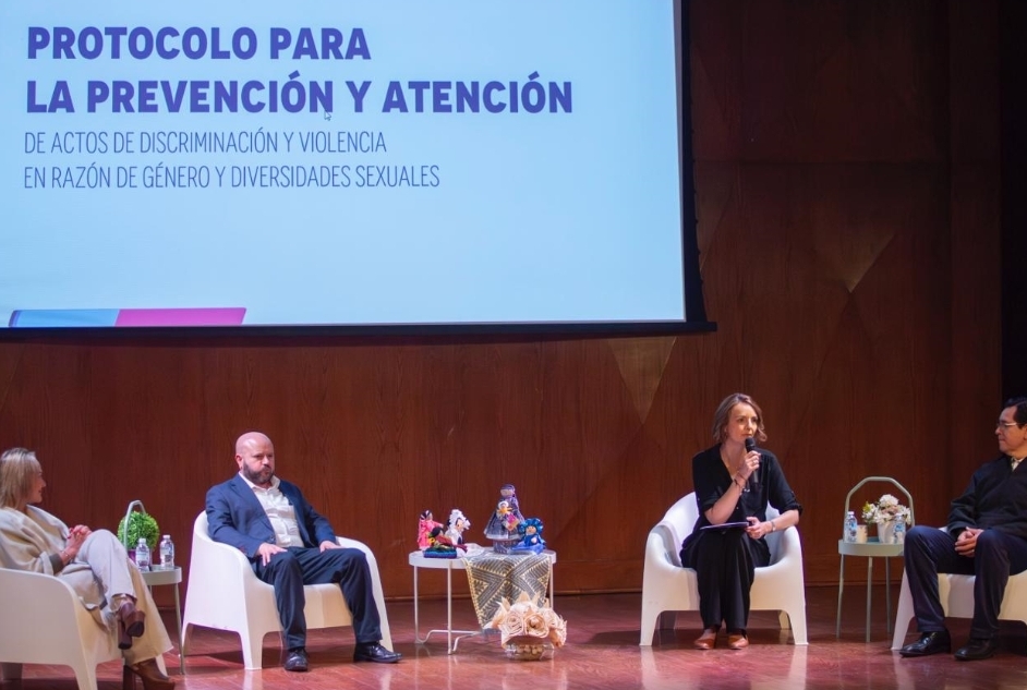 Durante su intervención, Sol Kuri destacó la importancia del protocolo para fortalecer entornos institucionales seguros, incluyentes y libres de discriminación, así como garantizar el respeto a los derechos humanos y la atención adecuada ante cualquier forma de violencia por razón de género y diversidad sexual.