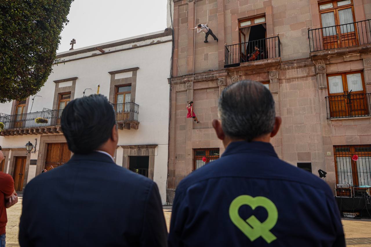 Al término del anuncio, una de las compañías que tendrá participación del Querétaro Experimental 2024 ofreció un performance de teatro aéreo en la fachada de la Delegación Centro Histórico.