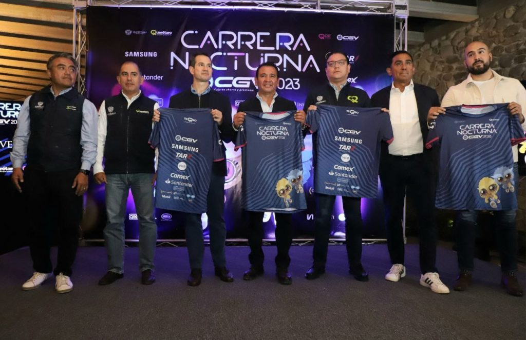 Ante patrocinadores, atletas e integrantes del H. Ayuntamiento de Querétaro, el Secretario de Desarrollo Humano y Social, Arturo Torres Gutiérrez, con la representación del Presidente Municipal de Querétaro, Luis Nava, presentó la imagen oficial de la playera y la medalla de la décimo segunda Carrera Nocturna CGV 2023 que lucirán los 5 mil corredores el próximo sábado 28 de octubre en las principales vialidades del Centro Histórico.
