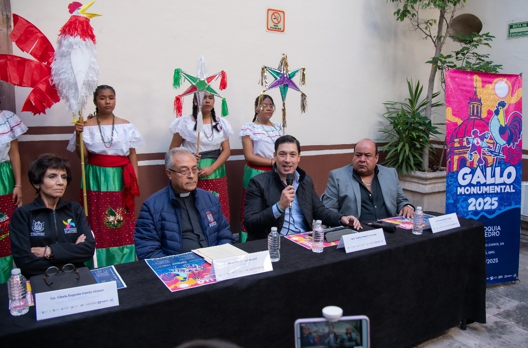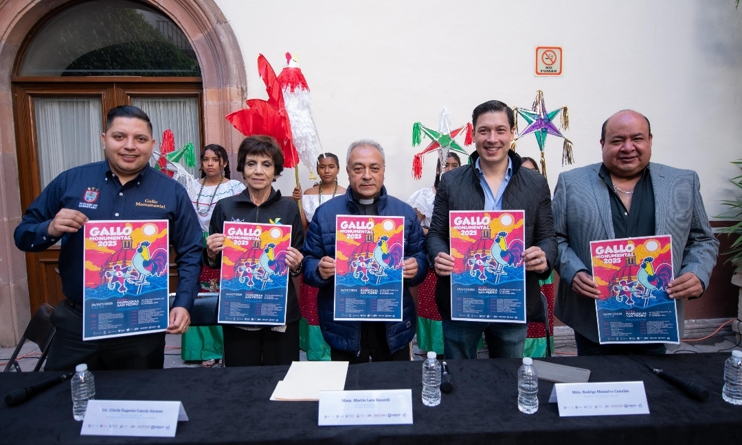 El presidente municipal de El Marqués, Rodrigo Monsalvo Castelán, en conjunto con el vicario y vocero general de la Diócesis de Querétaro, José Martín Lara Becerril, encabezaron la rueda de prensa del “Gallo Monumental 2025”, festividad que se realizará este 25 de octubre del presente año.