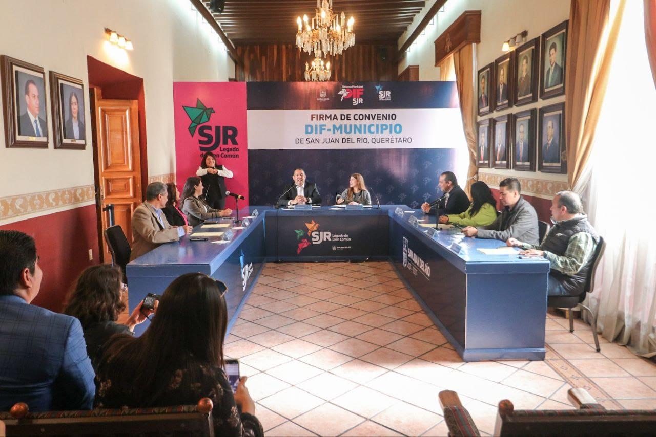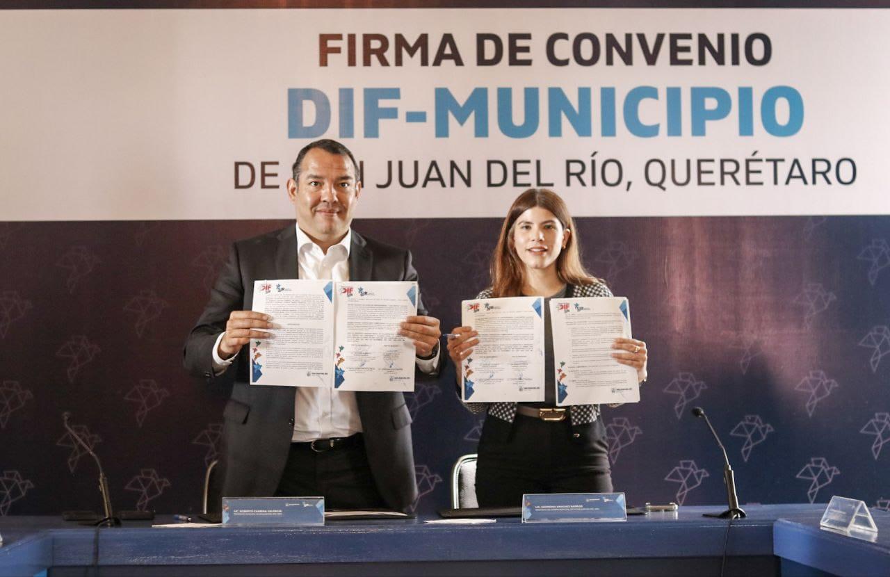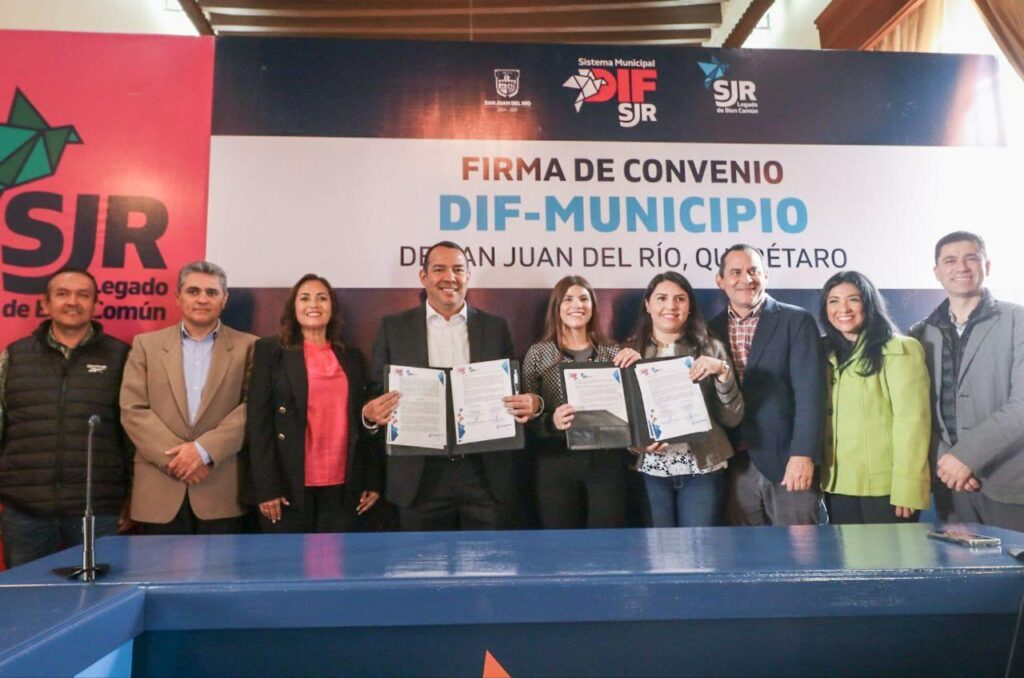 En beneficio de la sociedad sanjuanense, del desarrollo de las personas y de las familias, el Sistema Municipal para el Desarrollo Integral de la Familia de San Juan del Río (DIF) y la Presidencia Municipal, firmaron un convenio, con la finalidad de establecer lazos de colaboración entre las diferentes Secretarías de la Administración Municipal y el DIF en la ejecución de los trabajos, acciones, actividades y programas que ejecute este organismo.