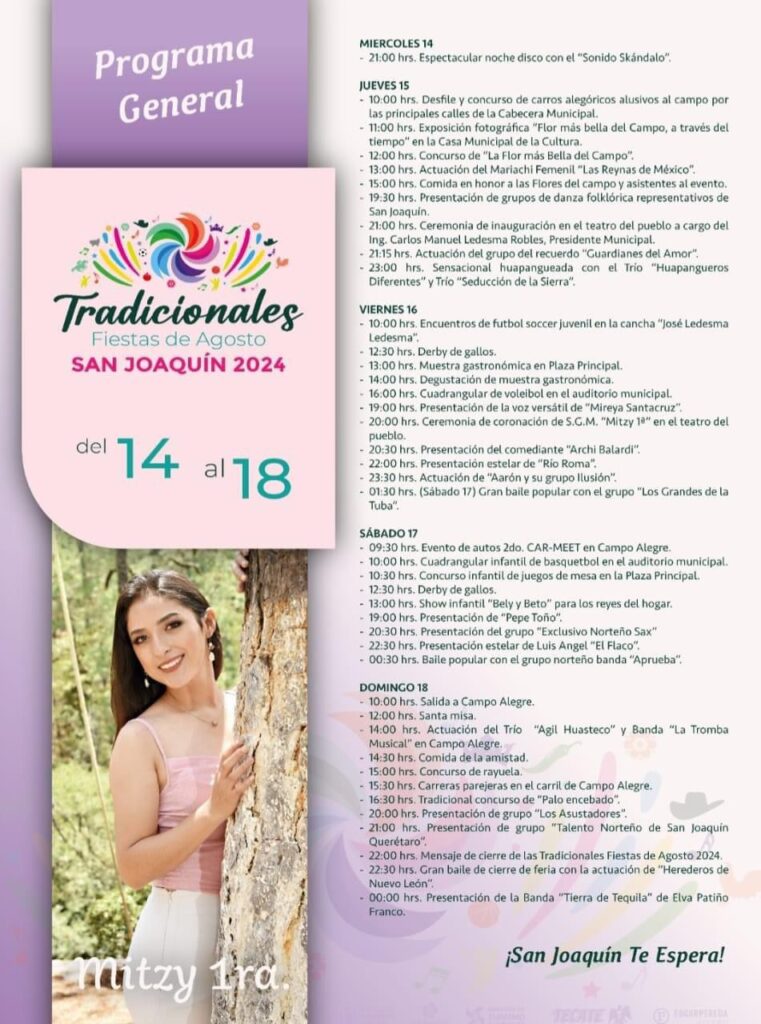 - 21:00 hrs. Presentación de grupo “Talento Norteño de San Joaquín Querétaro”.