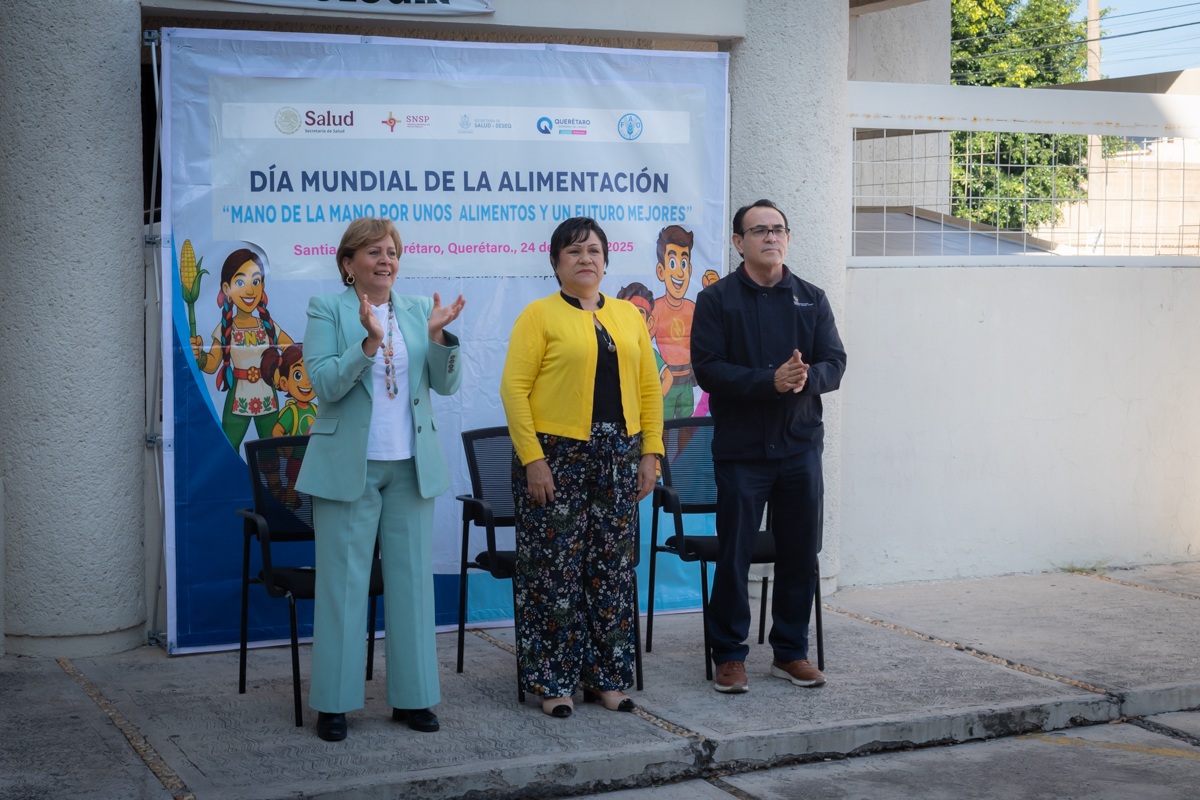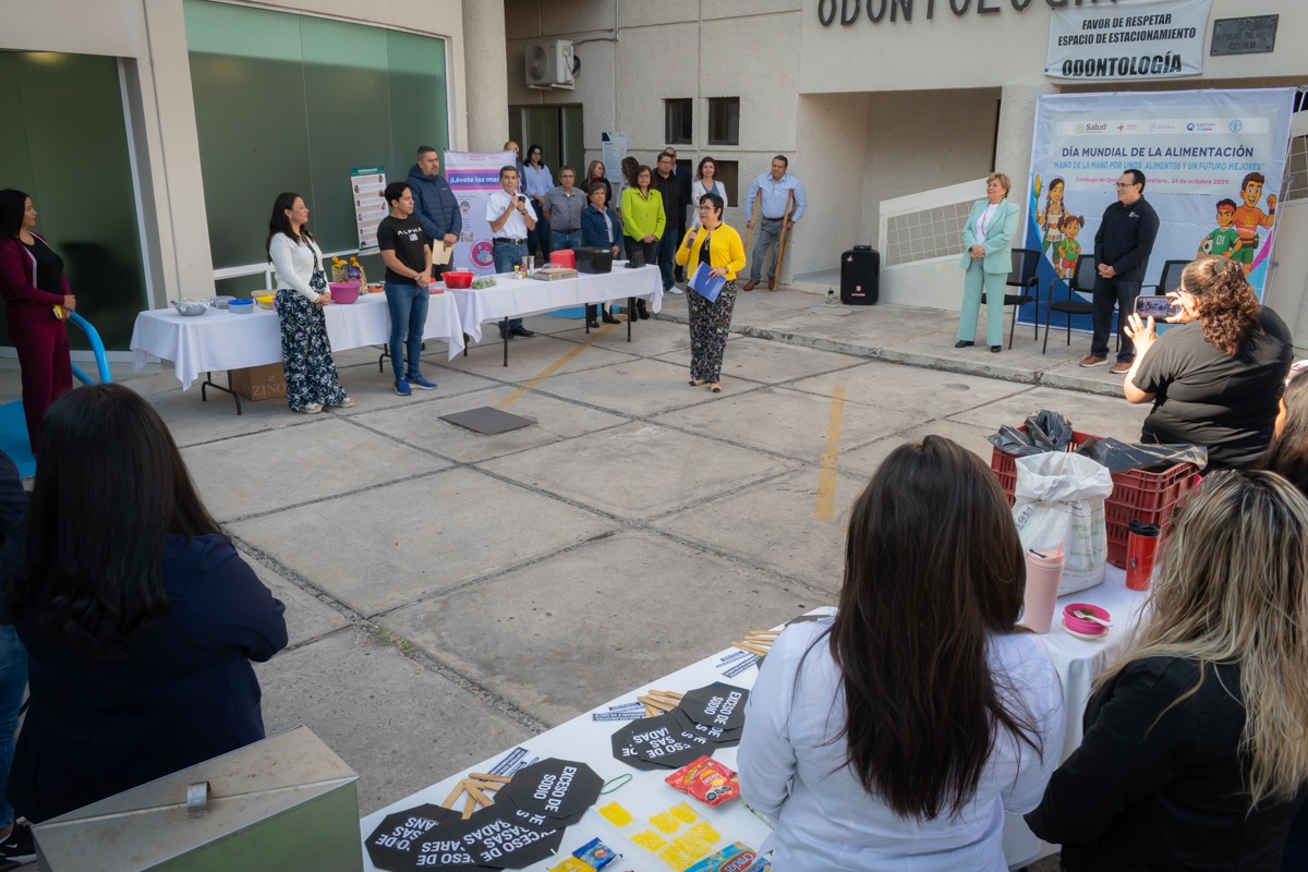 La secretaria de Salud del estado, María Martina Pérez Rendón, encabezó la ceremonia conmemorativa del Día Mundial de la Alimentación y del Día Mundial del Lavado de Manos, realizada con el personal de las oficinas administrativas de los Servicios de Salud del Estado de Querétaro (SESEQ). Durante su mensaje, destacó que el lema de este año, «Mano a mano por unos alimentos y un futuro mejores», subraya la importancia de la colaboración entre instituciones, comunidades y familias para construir entornos más saludables, en este caso, a través de una alimentación adecuada.
