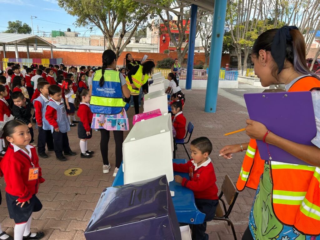 Asimismo, en cada salón se discutió la importancia del voto libre y secreto, y con el apoyo del Instituto Nacional Electoral (INE), se gestionó el préstamo de urnas y mamparas para realizar un ejercicio similar a un proceso electoral auténtico. A la vez que se designaron estudiantes como jefes de casilla, quienes colaboraron en la organización del evento, reforzando valores como la responsabilidad y el trabajo en equipo.