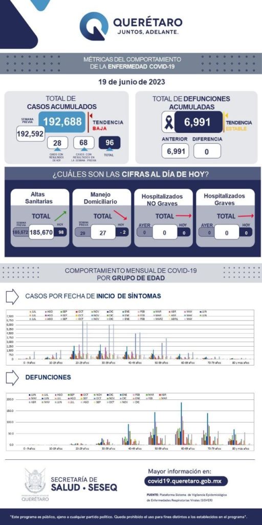 La Secretaría de Salud de Querétaro reportó este lunes cero defunciones por COVID-19 y reportó que en los últimos siete días se han sumado 96 casos de la enfermedad en el estado; se trata de 57 mujeres y 39 hombres. El registro acumulado es de 192 mil 688 casos; 54% son mujeres y 46% son hombres.