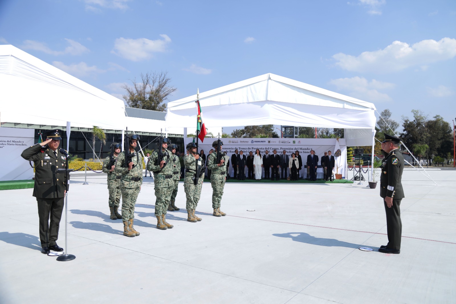 El secretario de Seguridad Ciudadana, Iován Elías Pérez Hernández, asistió a la ceremonia de Toma de Protesta al Cargo, Posesión del Mando y Protesta de Bandera del General de División Diplomado de Estado Mayor, Jorge Pedro Nieto Sánchez, quien asumió como Comandante Interino de la XII Región Militar, con sede en Irapuato.