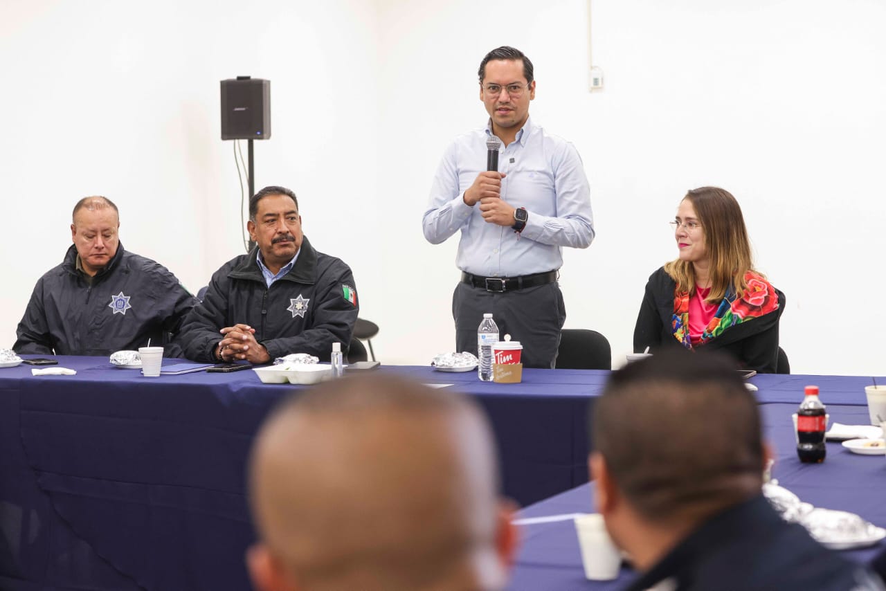 En su intervención, el secretario de Seguridad Pública Municipal, Ángel Rangel, agradeció al Presidente Municipal su cercanía y le dio a conocer que ya se lleva a cabo el proceso para la selección de las y los vocales para la integración de la Comisión de Carrera Policial.