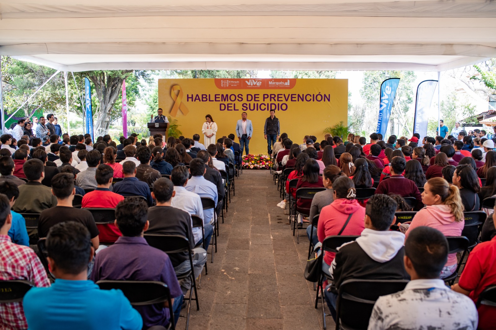 Ante 500 asistentes, el director de Centro Vive, Rafael López Jiménez, destacó que la dependencia cuenta con psicólogos y personal especializado que contribuye a la salud mental, pues oferta servicios como atención psicológica y psiquiátrica especializada en conductas suicidas, talleres preventivos en secundarias, conferencias y pláticas de concientización para conductas suicidas y contención psicológica en planteles educativos, por lo que invitó a los marquesinos que requieran ayuda, a formar parte de estos servicios gratuitos.