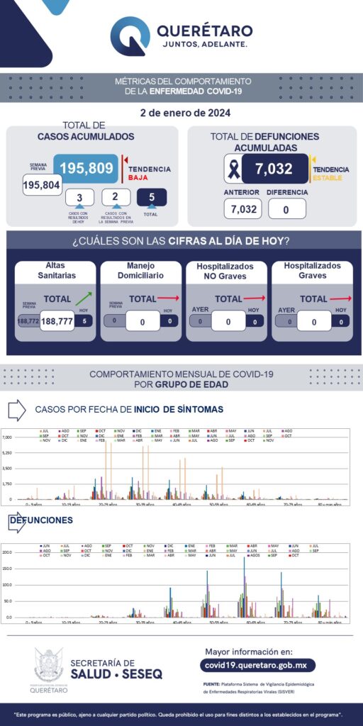 La Secretaría de Salud de Querétaro reportó este lunes cero defunciones por COVID-19 y reportó que en los últimos siete días se han sumado cinco casos de la enfermedad en el estado; se trata de tres mujeres y dos hombres. El registro acumulado es de 195 mil 809 casos; 54% son mujeres y 46% son hombres.