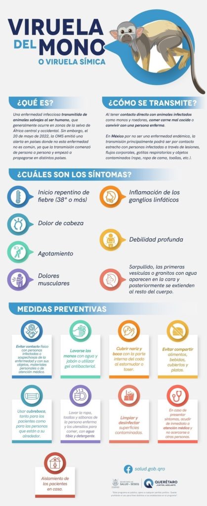 Cabe señalar que el sistema estatal de salud realiza la vigilancia epidemiológica a través de las unidades de primer y segundo nivel de atención. La viruela símica o del mono dura en promedio 21 días, se transmite por contacto directo con las secreciones de una persona enferma por medio de mucosas o lesiones de la piel, gotitas respiratorias y objetos contaminados con los líquidos corporales.