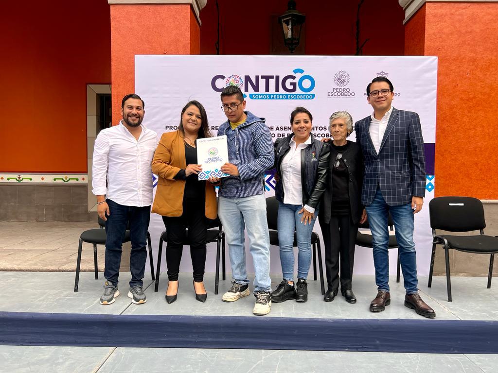 La secretaria de Desarrollo Sustentable, Mercedes Ponce Tovar, en representación del presidente municipal de Pedro Escobedo, Amarildo Bárcenas Reséndiz, de la mano con la subdirectora del Registro Público de la Propiedad, Sandra Patricia Martínez, y en coordinación con el secretario de Desarrollo Humano y Social, Marlon Rivera, hicieron la entrega de escrituras a los habitantes de la colonia Bosques del Sur del ejido El Sauz, acción que beneficio a un total de 62 familias.