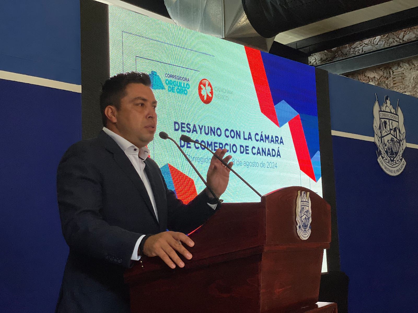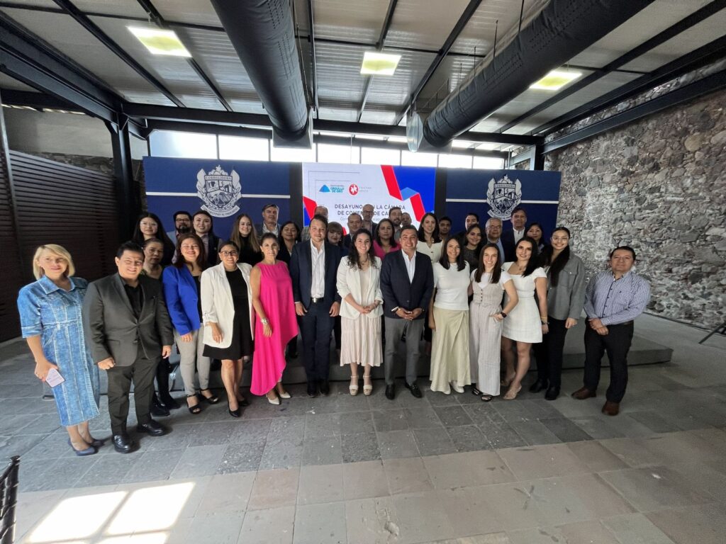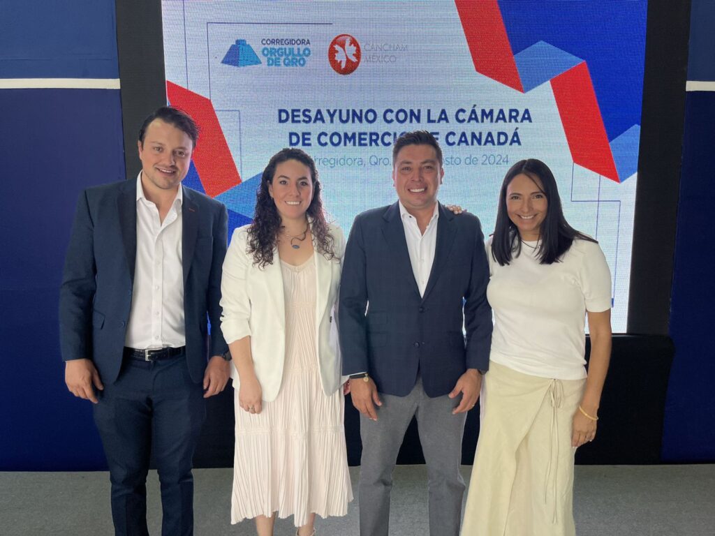 El presidente municipal de Corregidora, Adolfo Colín Sánchez, encabezó un desayuno con integrantes de la Cámara de Comercio de Canadá en México, donde les compartió las cualidades con las que cuenta la demarcación para la instalación de empresas.
