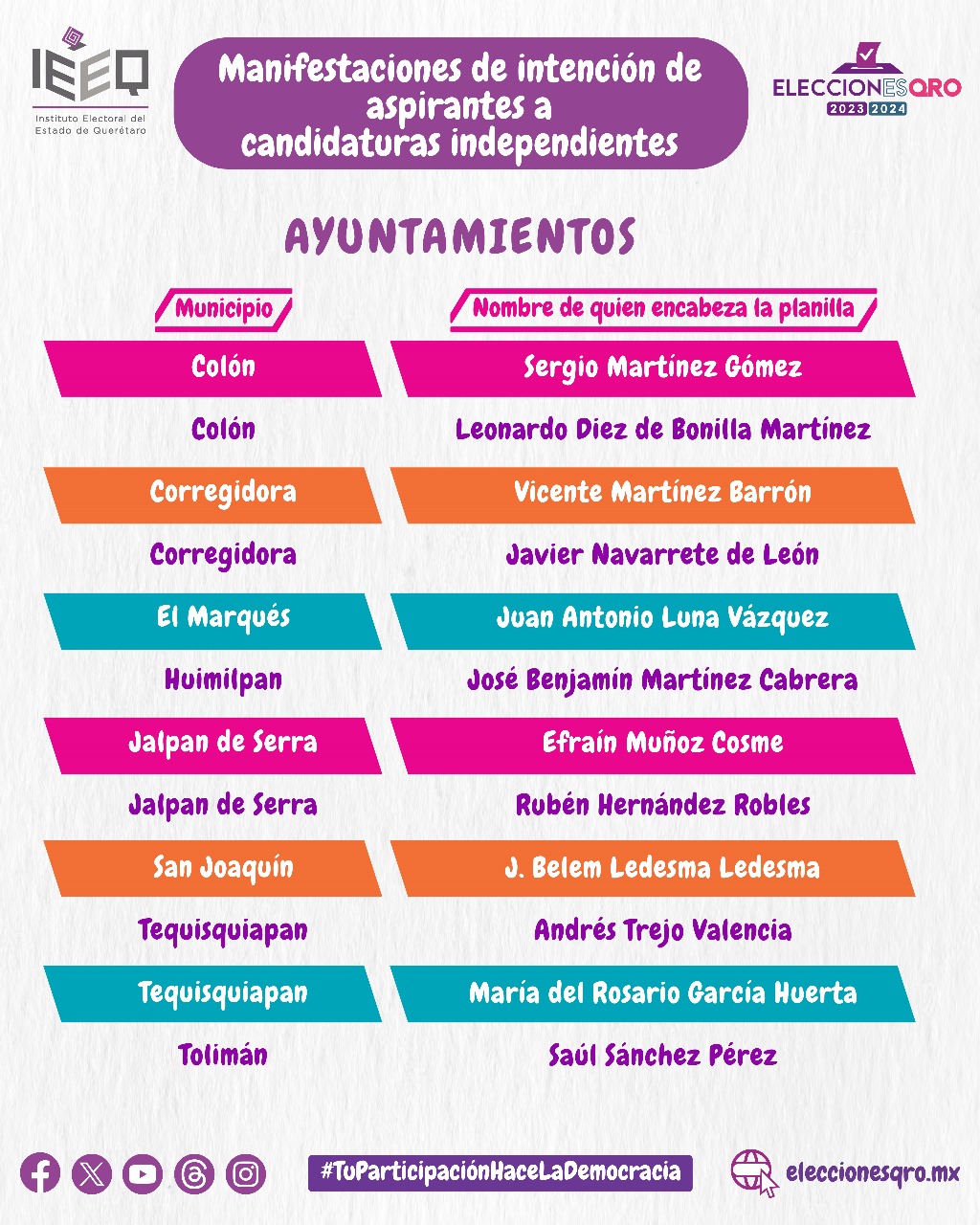 Para el ayuntamiento de Colón, Sergio Martínez Gómez y Leonardo Diez de Bonilla Martínez; para Corregidora, Vicente Martínez Barrón y Javier Navarrete de León; para El Marqués, Juan Antonio Luna Vázquez; para Huimilpan, José Benjamín Martínez Cabrera; para Jalpan de Serra, Efraín Muñoz Cosme y Rubén Hernández Robles; para San Joaquín, J. Belem Ledesma Ledesma; para Tequisquiapan, Andrés Trejo Valencia y María del Rosario García Huerta, y para Tolimán, Saúl Sánchez Pérez.