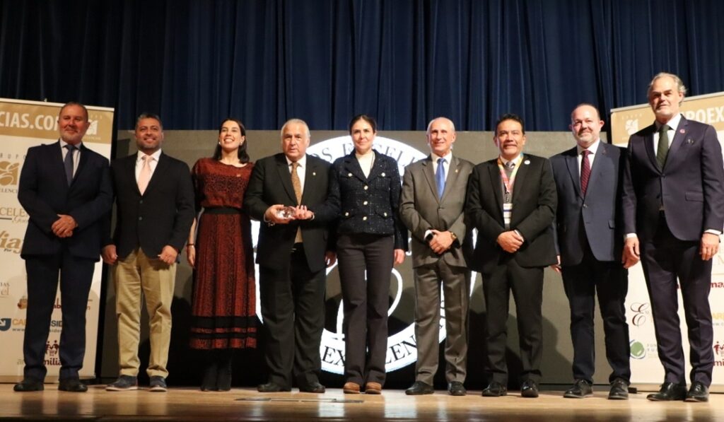 La secretaria de Turismo del estado de Querétaro, Adriana Vega Vázquez Mellado, en compañía del director del Querétaro Centro de Congresos (QCC), Alfredo Espinosa Leal, recibió la distinción de manos del presidente de Grupo Excelencias, José Carlos de Santiago, durante un evento celebrado en el Auditorio Sur de IFEMA, sede de la feria española.