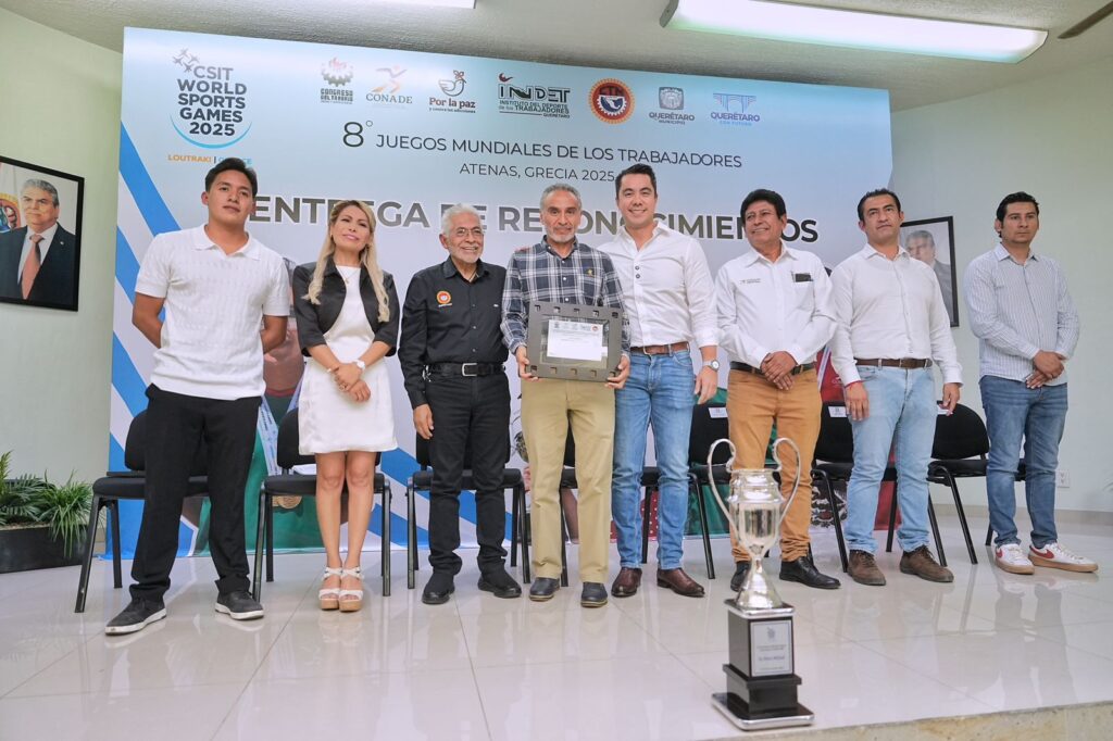 - El presidente municipal de Querétaro, Felifer Macías, entregó reconocimientos a las y los 25 atletas queretanos afiliados a la CTM que representaron a México en la octava edición de los Juegos Mundiales de los Trabajadores, celebrada en Atenas, Grecia, donde lograron un destacado segundo lugar a nivel internacional al obtener un total de 76 medallas en disciplinas como ajedrez, atletismo, natación y voleibol de playa femenil.