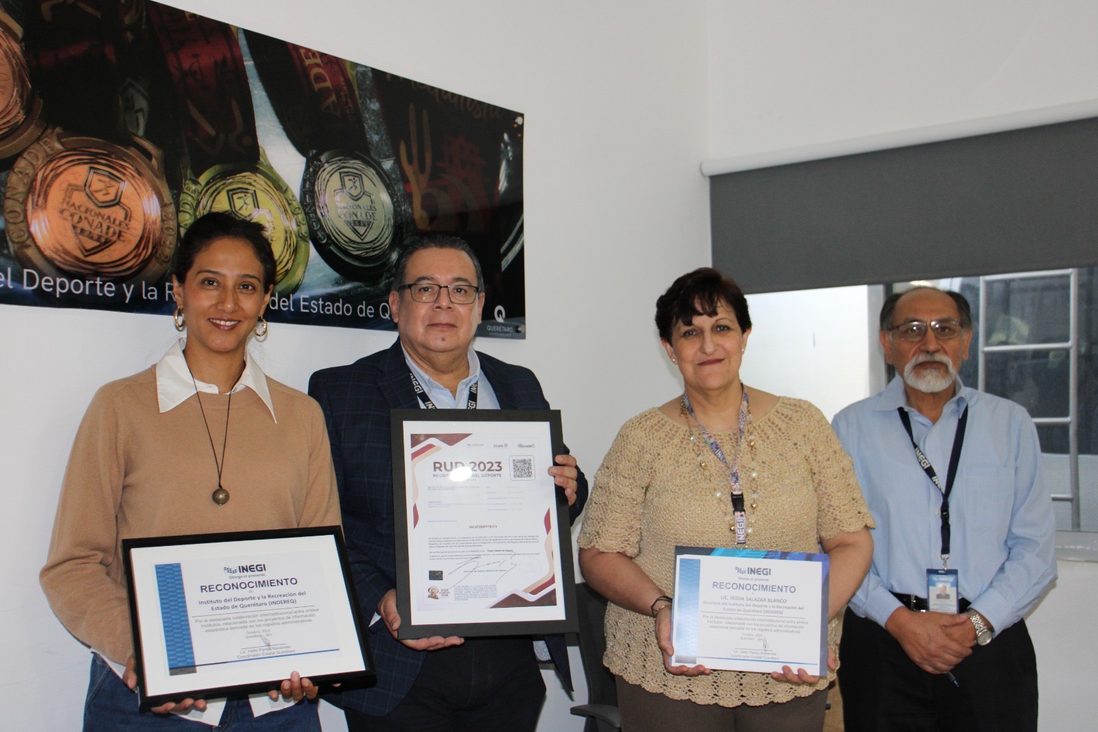 La directora general del Instituto del Deporte y la Recreación del Estado (INDEREQ), Iridia Salazar Blanco, recibió un reconocimiento por parte del personal de la delegación estatal del Instituto Nacional de Estadística y Geografía (INEGI) por la colaboración en la actualización de bases de datos de instalaciones deportivas.