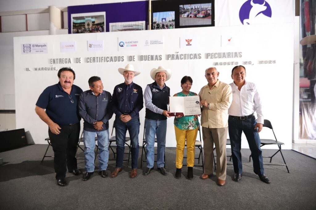 El secretario de Desarrollo Agropecuario, Rosendo Anaya, encabezó la entrega de siete certificados de Buenas Prácticas pecuarias y 31 reconocimientos a productores del Estado, que aplicaron para los planes de trabajo del Comité Estatal para el Fomento y Protección Pecuaria del Estado de Querétaro (CEFPPEQ), lo que promueve la conservación y mejora del estatus de inocuidad en los municipios y regiones de la entidad.