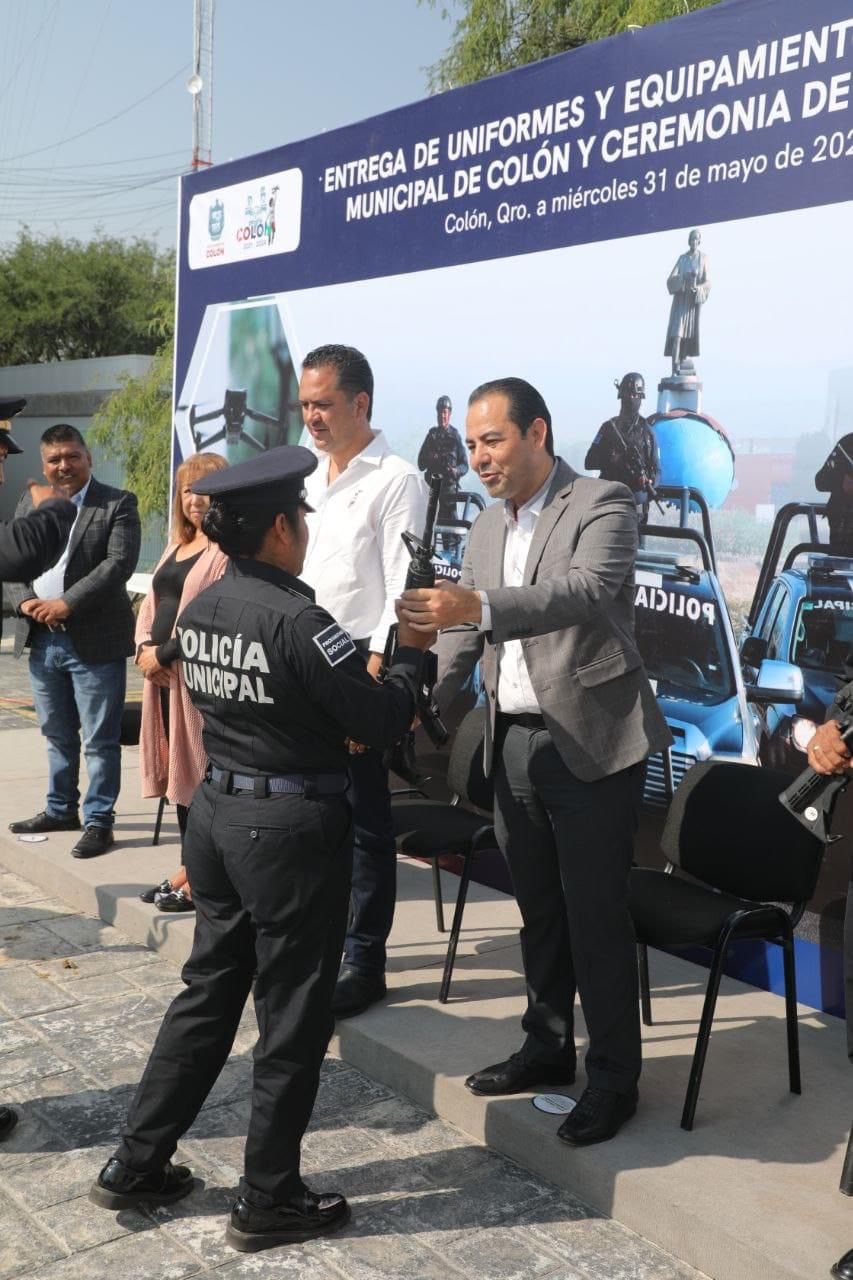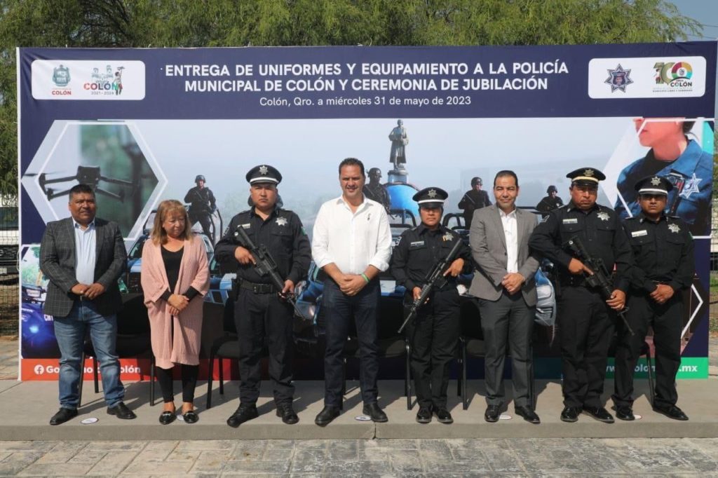 El Presidente Municipal de Colón, Manuel Montes Hernández, encabezó la Entrega de Uniformes, Armamento y Equipamiento a la Policía local y Ceremonia de Jubilación, donde reconoció a todos los elementos por arriesgar a diario la vida, para preservar la seguridad y paz social del Municipio.