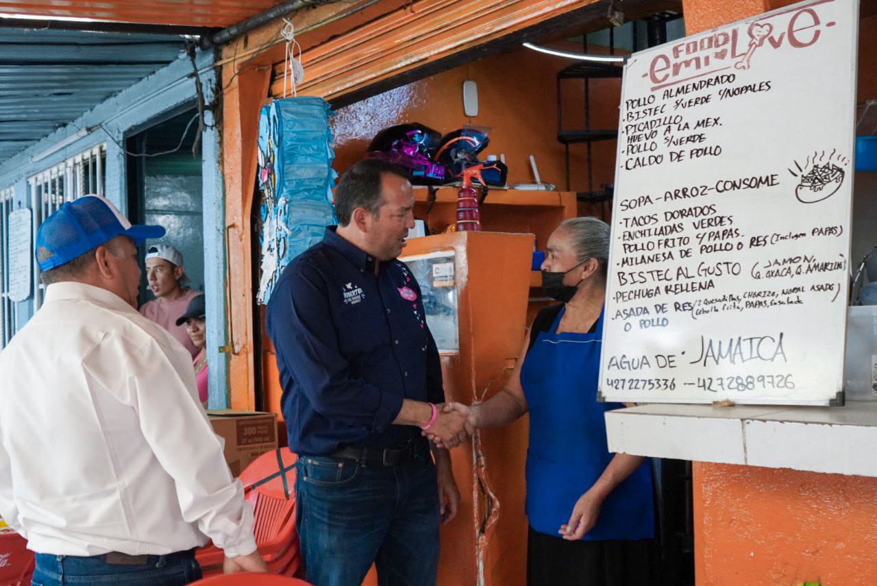 Roberto Cabrera Valencia -quien estuvo acompañado por integrantes de la Mesa Directiva del Mercado 5 de Mayo, integrada por el secretario general, Miguel Ángel López Arcadio; el secretario de Organización, Roberto Méndez Ríos; el secretario de Conflictos, Rubén Sánchez Manzo; y la representante del comercio en pequeño, Teresa Paredes López-, convocó a la ciudadanía a apoyar su proyecto el próximo 2 de junio a través del voto para que gane San Juan del Río.