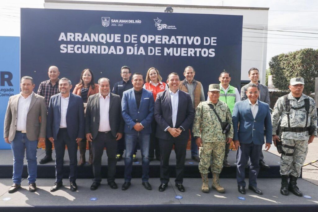 Con el objetivo de garantizar la seguridad, facilitar la movilidad, proteger el patrimonio y brindar atención a las y los sanjuanenses y visitantes, el presidente municipal de San Juan del Río, Roberto Cabrera Valencia, en conjunto con representantes de las fuerzas de seguridad municipales, estatales y federales, cuerpos de atención de emergencias y autoridades de Protección Civil, dieron el banderazo de arranque del “Operativo de Seguridad Día de Muertos”.