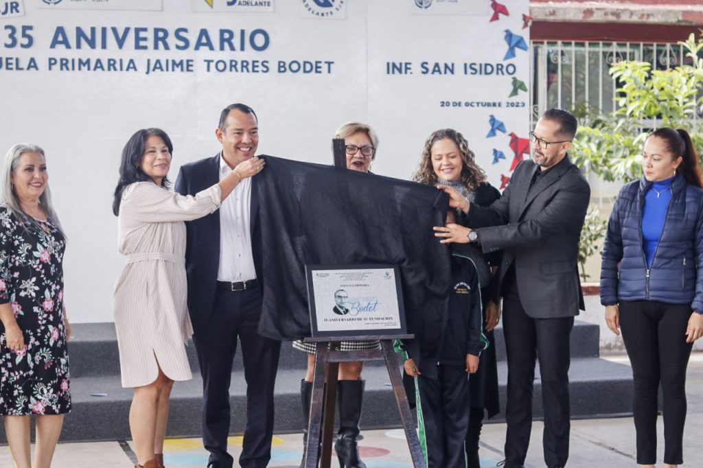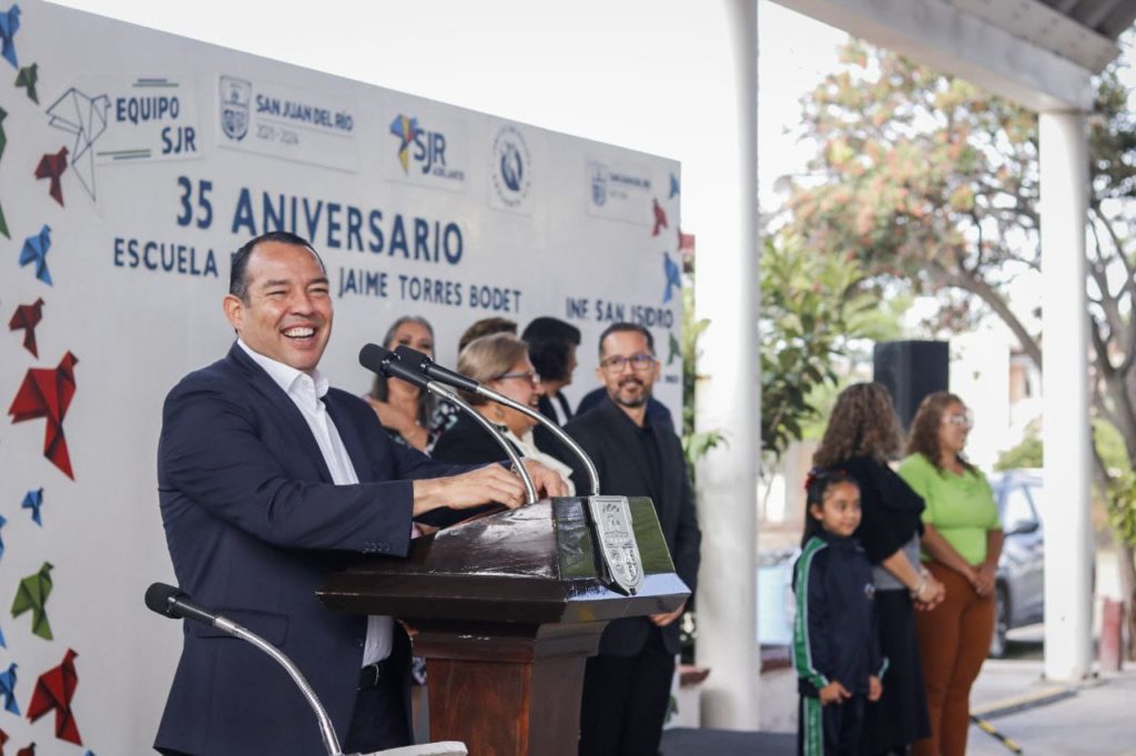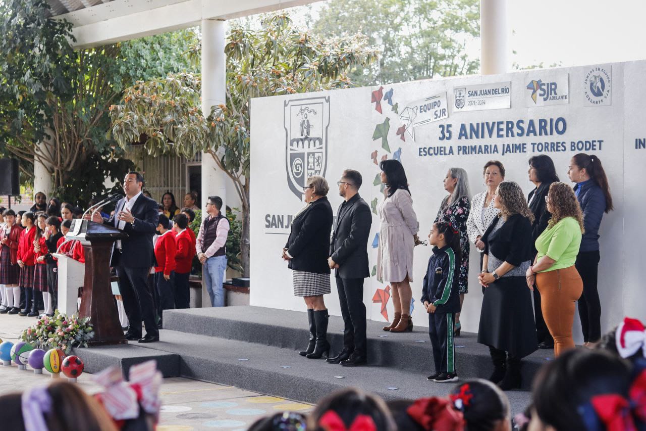El presidente municipal de San Juan del Río, Roberto Cabrera Valencia, encabezó la ceremonia del 35 Aniversario de la escuela primaria Jaime Torres Bodet, ubicada en Infonavit San Isidro, donde destacó que la comunidad escolar de este centro educativo ha sido parte de la construcción de la sociedad, además, afirmó, son pieza clave en los pilares de la calidad de vida de San Juan del Río.