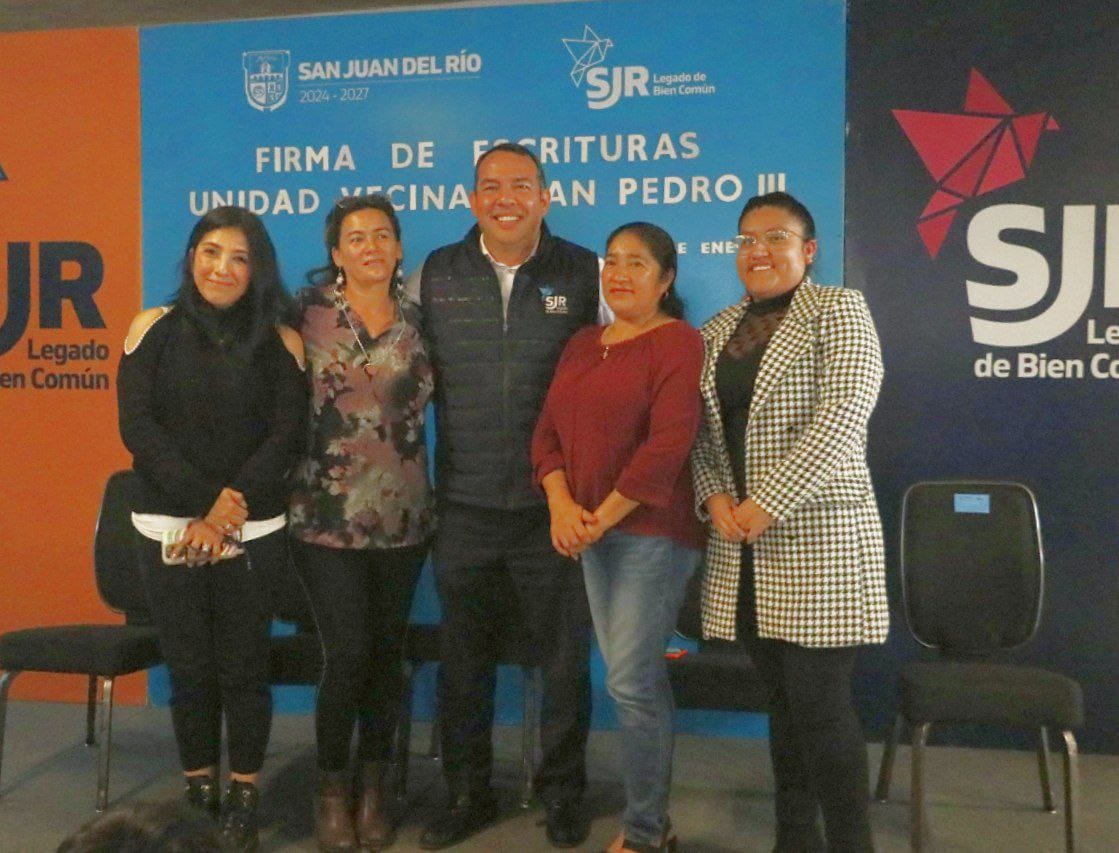 Con el propósito de brindar certeza jurídica a 43 familias de la Unidad Vecinal San Pedro lll, el presidente municipal de San Juan del Río, Roberto Cabrera Valencia, formalizó la firma de 43 escrituras, con las cuales refrendó su compromiso de generar tranquilidad entre los habitantes de estos asentamientos humanos.