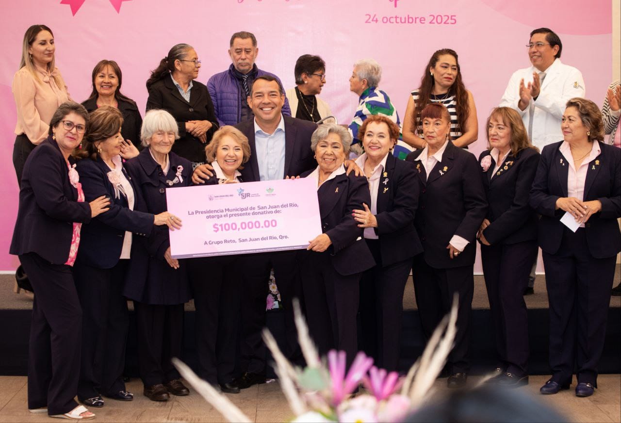 La presidenta de Grupo Reto San Juan del Río, Fernanda González Torres, agradeció a la presidenta del Sistema Municipal para el Desarrollo Integral de la Familia, Gina Sánchez Barrios, y al presidente municipal de San Juan del Río, Roberto Cabrera Valencia, por el apoyo que han brindado a la asociación que, entre otras actividades, lleva pláticas educativas a las comunidades para la prevención del cáncer.