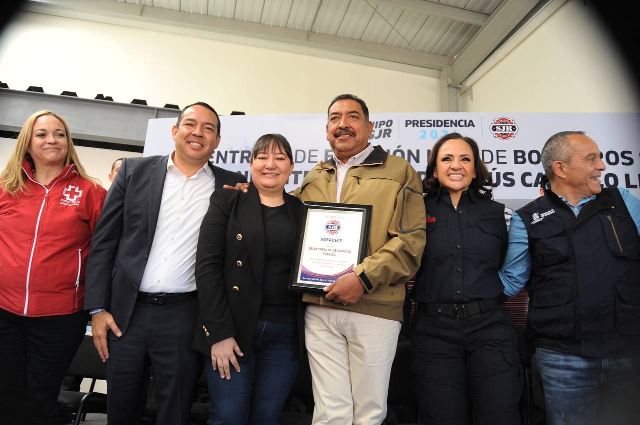 La titular de la Coordinación Municipal de Protección Civil, Verónica Laguna Luján, en representación de Bomberos de San Juan del Río, entregó un reconocimiento al secretario de Seguridad Pública Municipal, Ángel Rangel Nieves, por su labor y Defender a la demarcación. En tanto, la presidenta del Consejo Directivo de Prevención y Ayuda A.C. otorgó un agradecimiento al presidente municipal Roberto Cabrera, por su labor para concretar el proyecto de la Estación 2 de Bomberos.