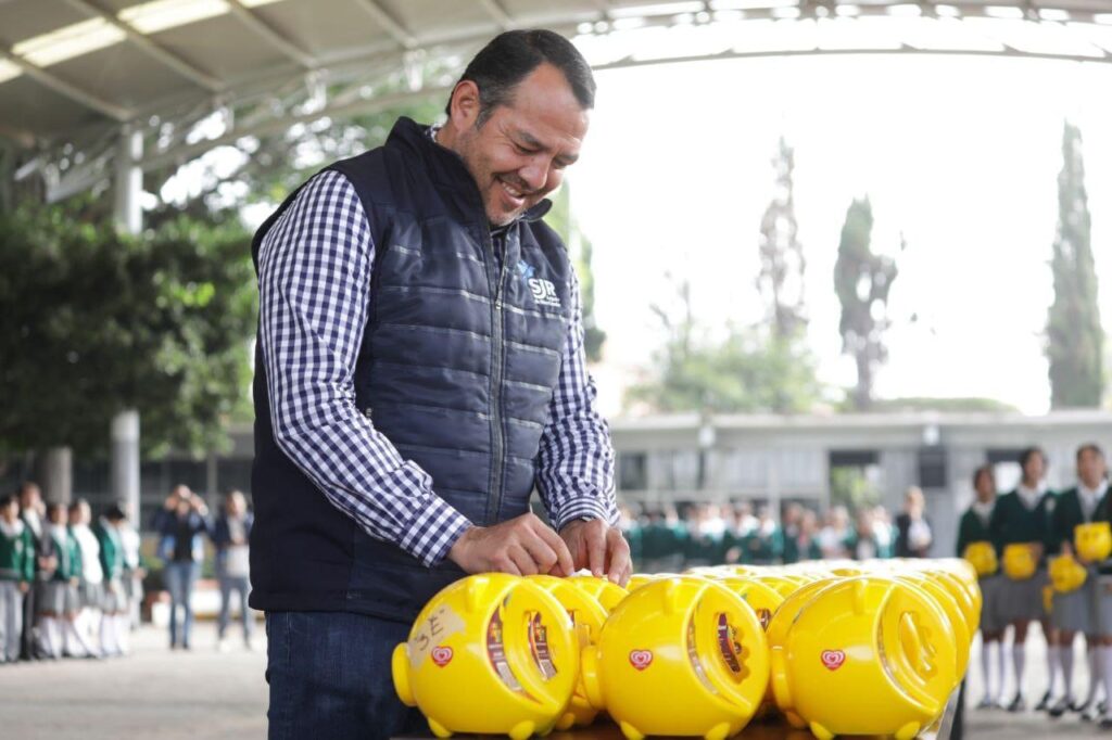 El presidente municipal de San Juan del Río, Roberto Cabrera Valencia, asistió a la entrega directa de los botes de la campaña 2025 de Fundación Teletón en la escuela secundaria Antonio Caso, ubicada en el Centro Histórico de la demarcación, evento en el que estuvieron presentes personal del plantel educativo y de la Fundación.