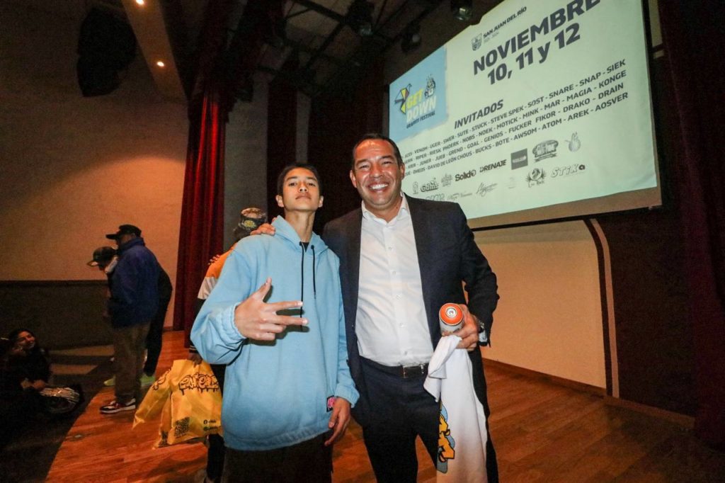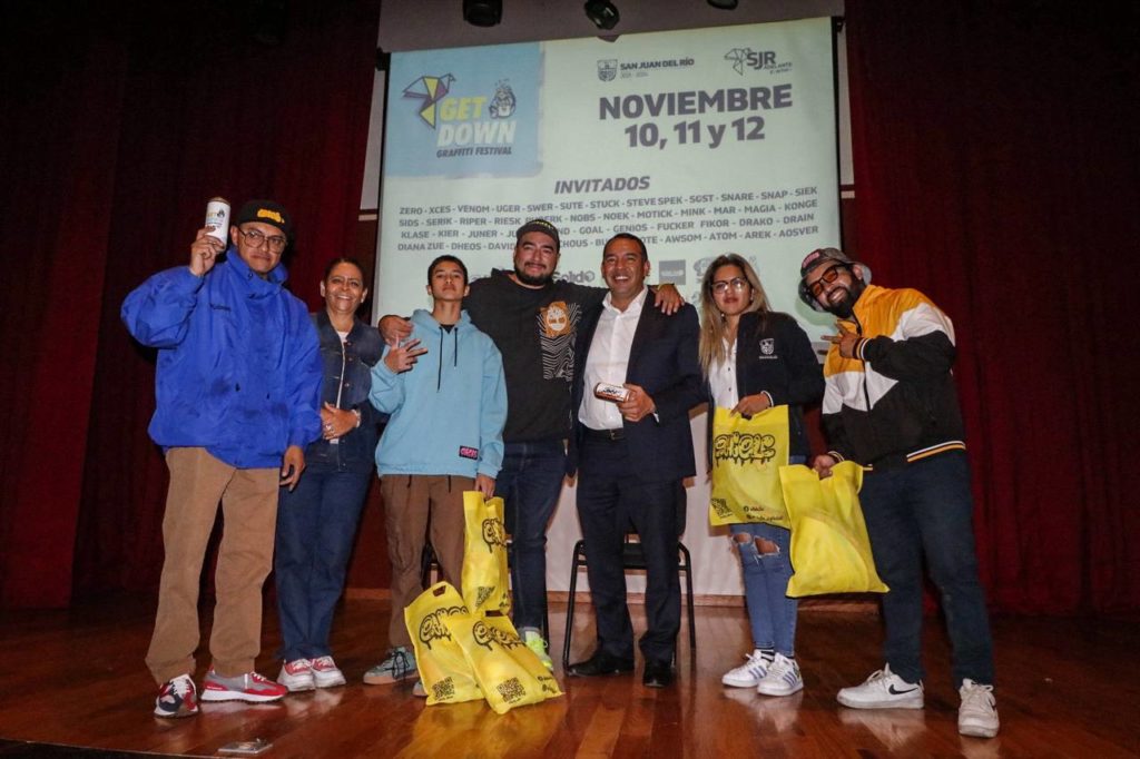 Con motivo del Festival de Grafiti, denominado Get Down en el municipio de San Juan del Río, el presidente municipal, Roberto Cabrera Valencia, fortaleció los lazos con los artistas urbanos para que esta ciudad sea un referente cultural donde los jóvenes se expresen a través de la pintura y los murales.