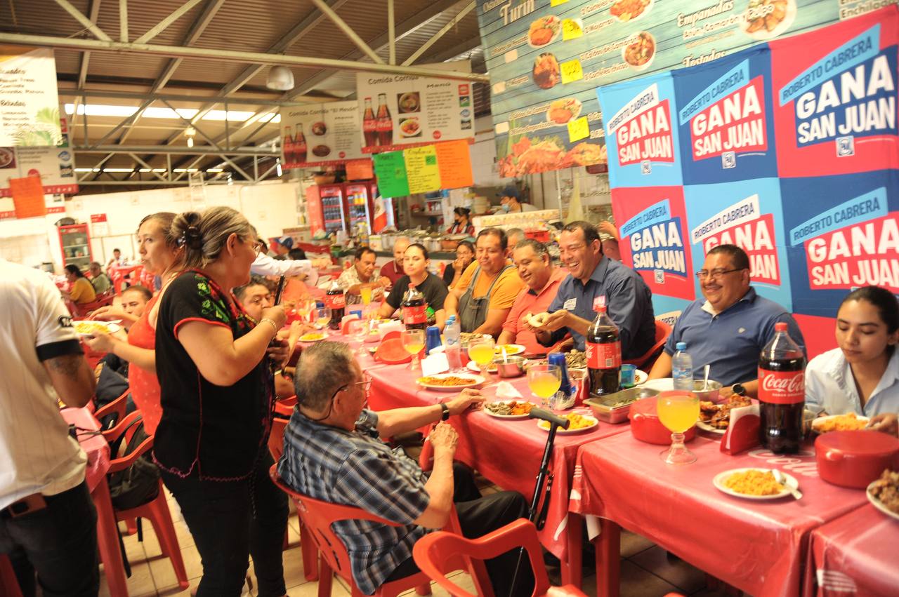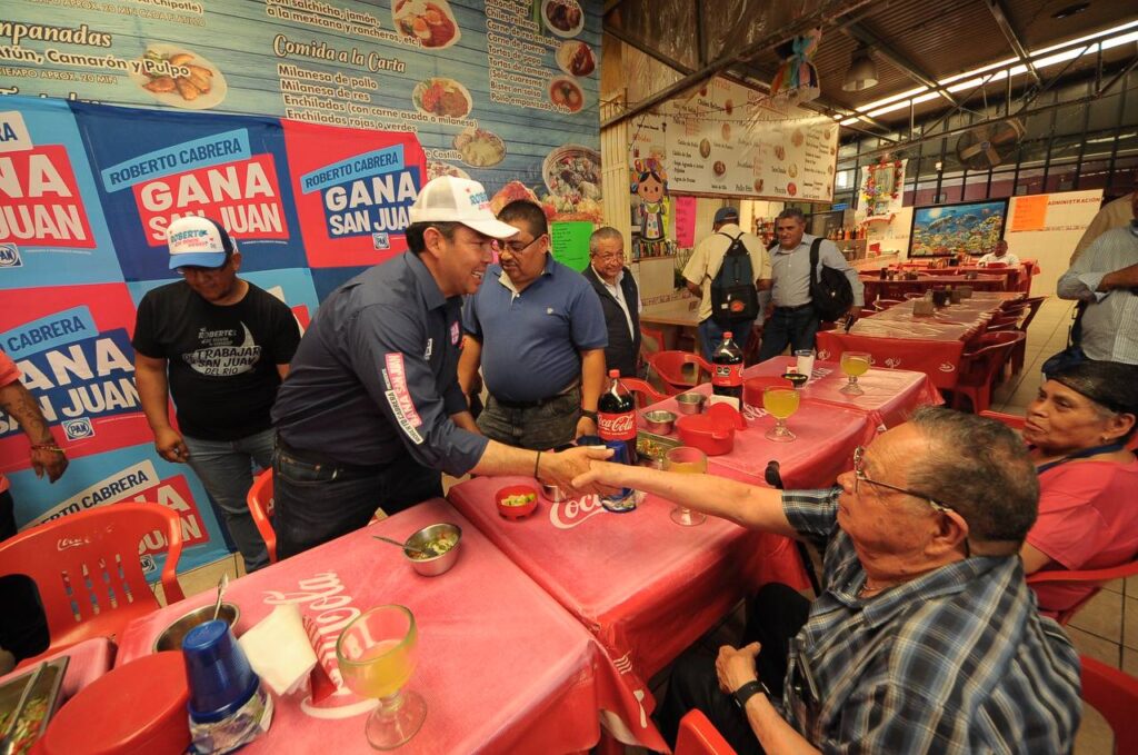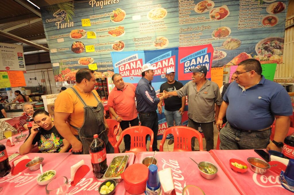 El candidato del Partido Acción Nacional (PAN) a la Presidencia Municipal de San Juan del Río, Roberto Cabrera Valencia, sostuvo una reunión con comerciantes del Mercado Reforma y del Centro Histórico. El encuentro se llevó a cabo en la zona de fondas del centro de abasto, donde escuchó los planteamientos de las y los comerciantes y convivió con los comensales que se encontraban presentes.
