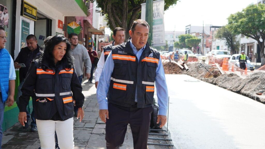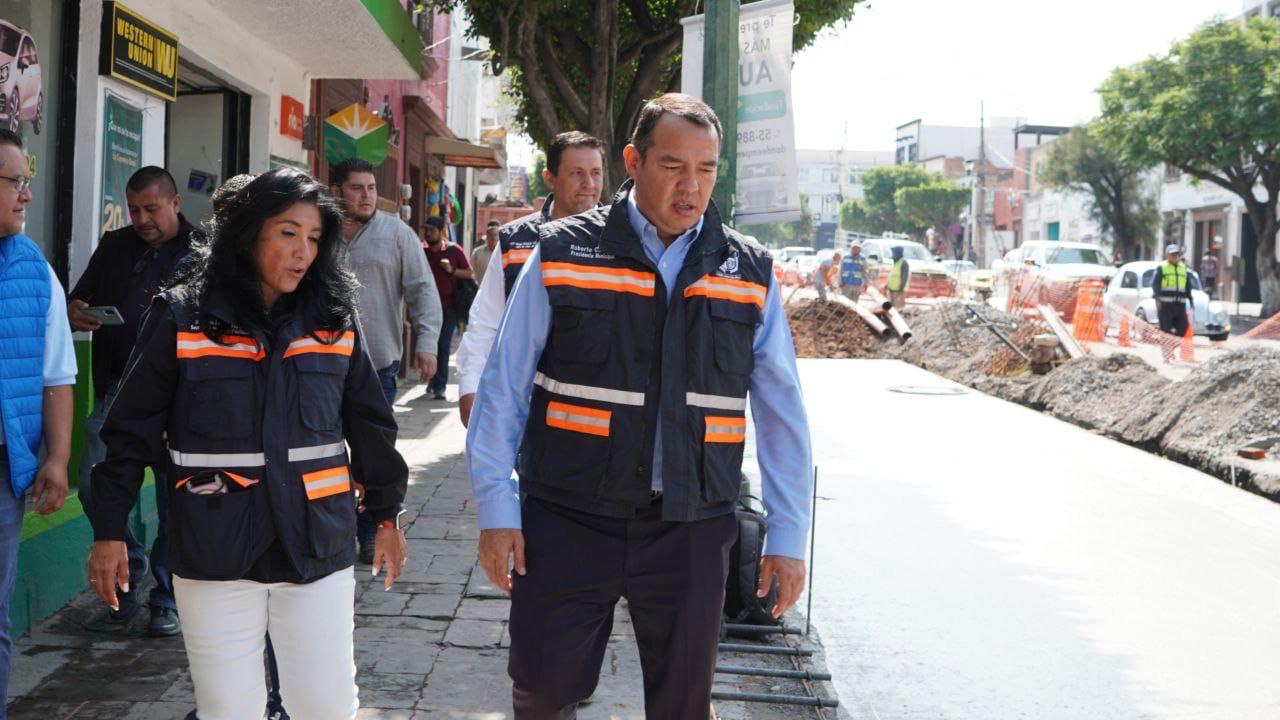 Con la finalidad de conocer el avance de la primera fase de la rehabilitación de avenida Juárez, el presidente municipal de San Juan del Río, Roberto Cabrera Valencia, realizó un recorrido en la zona, cuyos trabajos -que actualmente registran 60 por ciento de avance- consisten en el colado del pavimento de concreto hidráulico, toda vez que la instalación de las redes de agua potable y drenaje ya concluyeron.