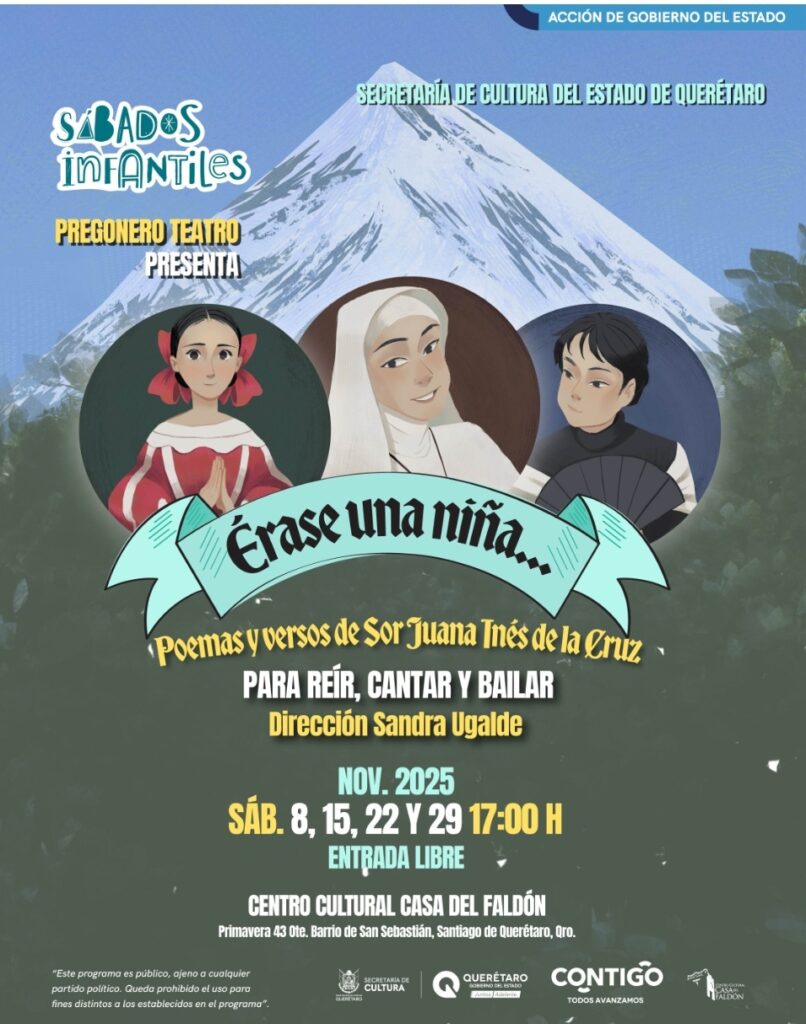 Como parte del ciclo Sábados Infantiles, el Centro Cultural Casa del Faldón presentará los días 8, 15, 22 y 29 de noviembre la obra “Érase una niña”, Poemas y versos de Sor Juana Inés de la Cruz para reír, cantar y bailar, bajo la dirección de Sandra Ugalde, a cargo del grupo El Pregonero Teatro.