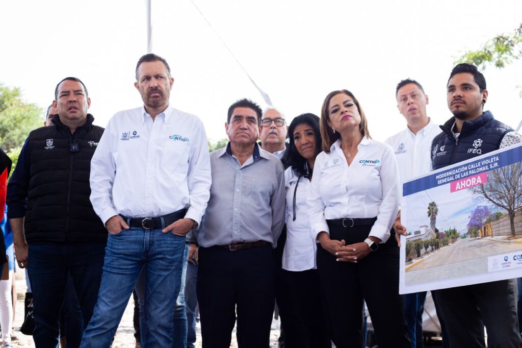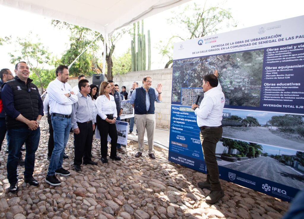 - El gobernador Mauricio Kuri, y el alcalde sanjuanense, Roberto Cabrera, entregaron la rehabilitación de calle Girasoles, en Senegal de Las Palomas, con 16 millones de pesos de inversión.