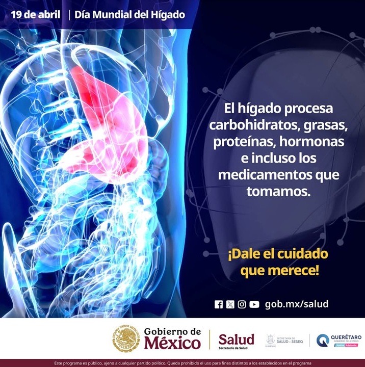 La Secretaría de Salud (SESA) del estado de Querétaro se suma a la conmemoración del Día Mundial del Hígado el 19 de abril. El lema para 2025 es “La comida es medicina.” Este órgano merece atención en cada etapa de la vida por lo que con esta efeméride se invita a marcar la diferencia a partir de hoy.