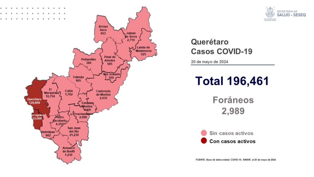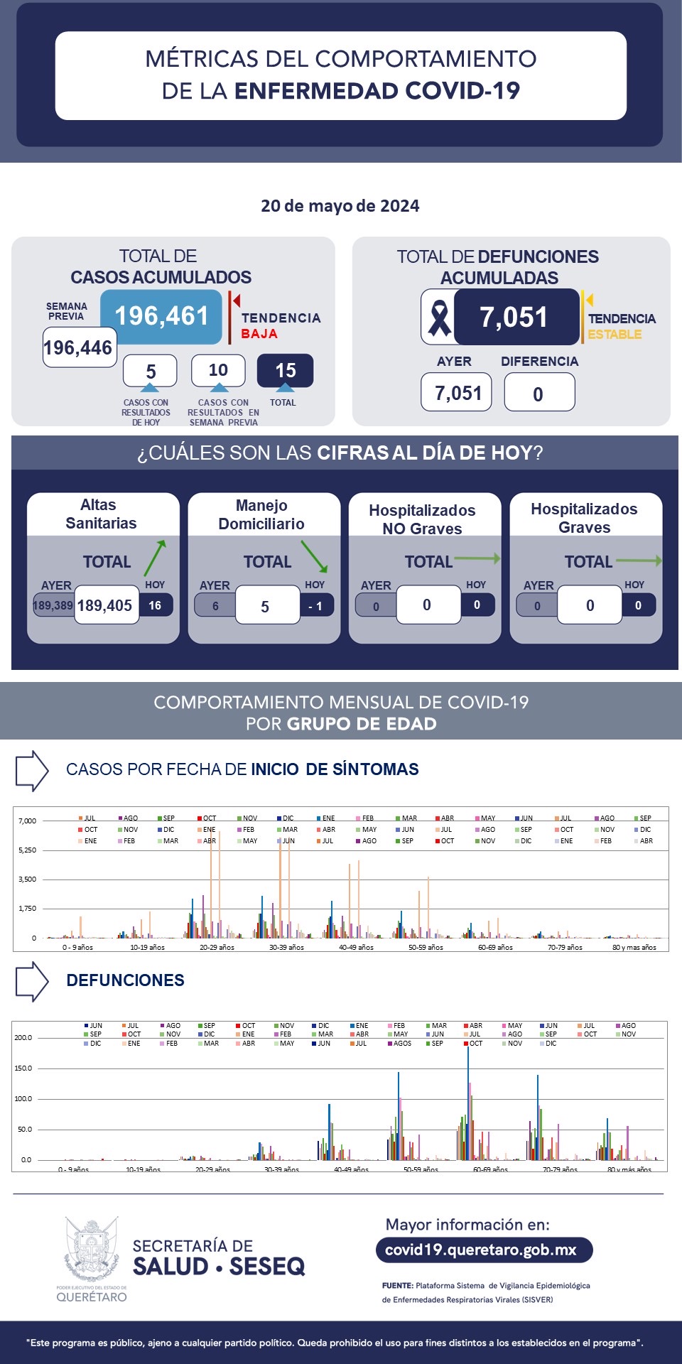 La Secretaría de Salud de Querétaro reportó este lunes cero defunciones por COVID-19 y que en los últimos siete días se han sumado 15 casos de la enfermedad en el estado; se trata de nueve mujeres y seis hombres. El registro acumulado es de 196 mil 461 casos; 54 por ciento son mujeres y 46 por ciento son hombres.