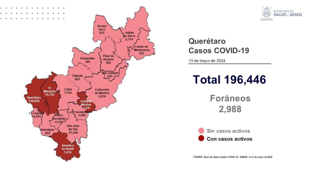 La Secretaría de Salud de Querétaro reportó este lunes cero defunciones por COVID-19 y que en los últimos siete días se han sumado once casos de la enfermedad en el estado; se trata de cinco mujeres y seis hombres. El registro acumulado es de 196 mil 446 casos; 54 por ciento son mujeres y 46 por ciento son hombres.