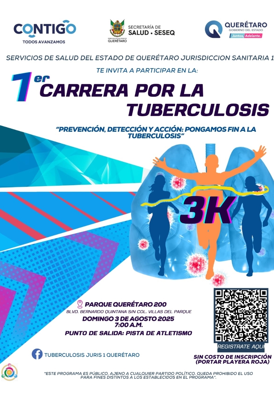 La Secretaría de Salud (SESA) del estado de Querétaro invita a la población en general, a la Primera edición de la Carrera Atlética de la Jurisdicción número 1 que se llevará a cabo con el propósito de fomentar la actividad física como factor protector de la salud e incrementar la conciencia social en torno a la prevención, detección oportuna y tratamiento gratuito de la tuberculosis.