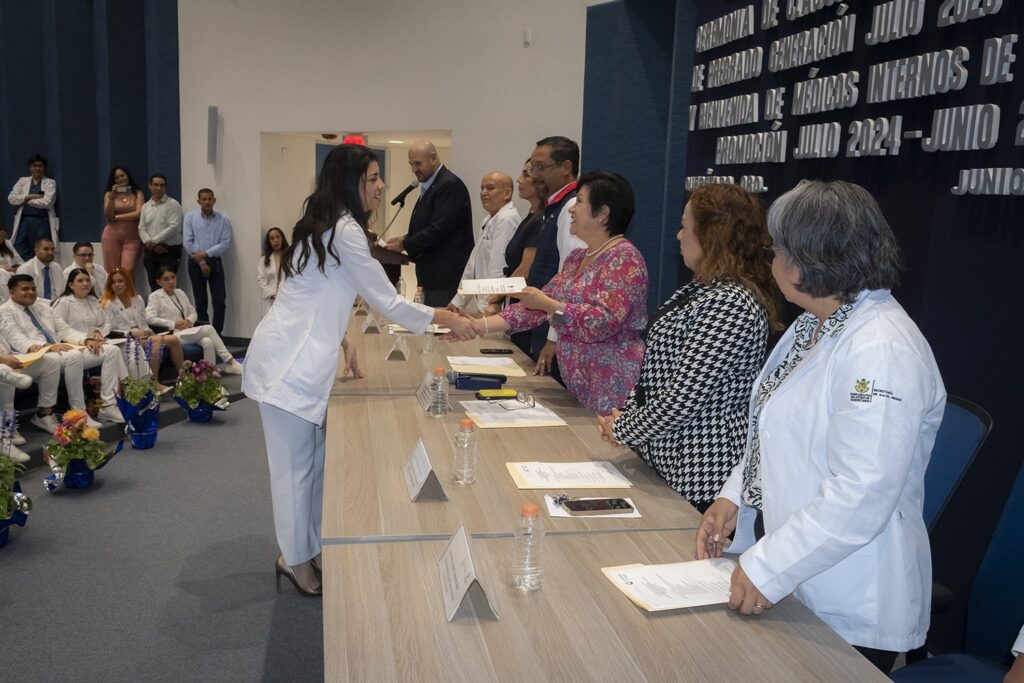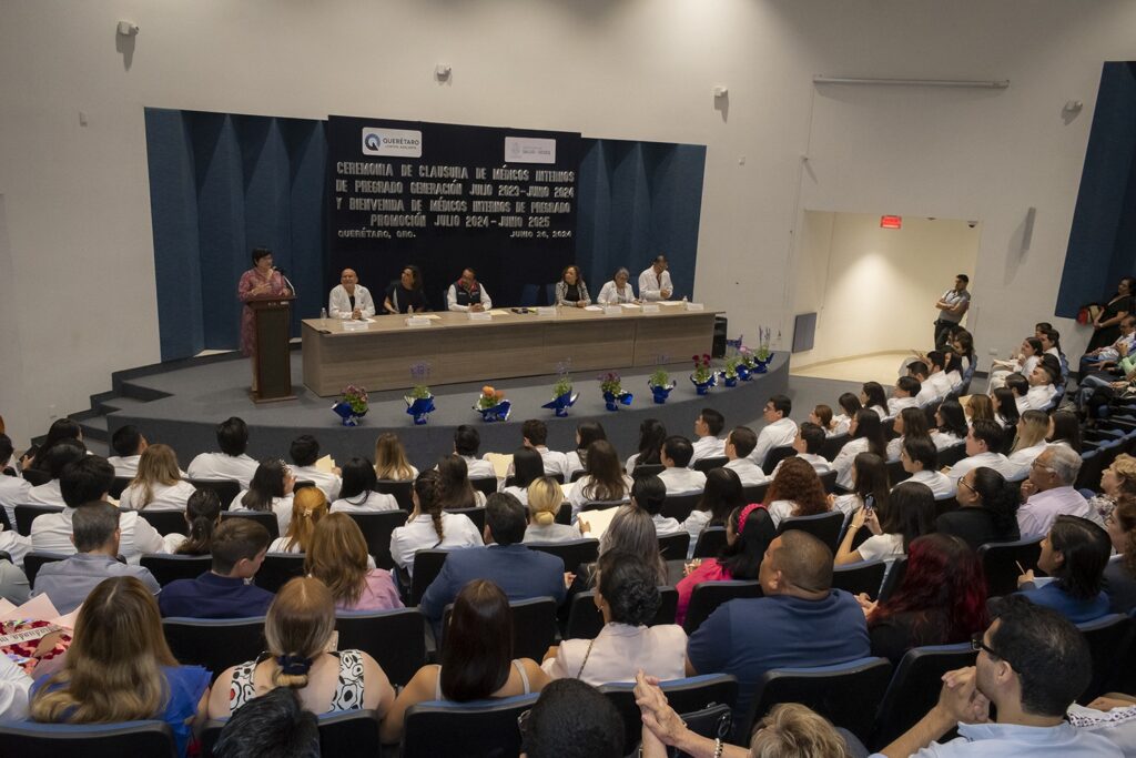 A las y los médicos que inician su internado se les dio la bienvenida e invitación para fortificar sus habilidades y destrezas con empatía, ética y humanismo para beneficio de la salud de los pacientes. Durante el evento participó el director de Servicios Médicos Hospitalarios, Hugo Daniel Cerrillo Cruz; la subdirectora de Enseñanza, Nora Angélica Castro Montes; la jefa de Departamento de Enseñanza, Deyanira Guevara Rico; el director del Hospital General de Querétaro, Leopoldo Espinoza Feregrino; el jefe de Enseñanza del Hospital General de Querétaro, Arturo García Balderas, entre otras personalidades.