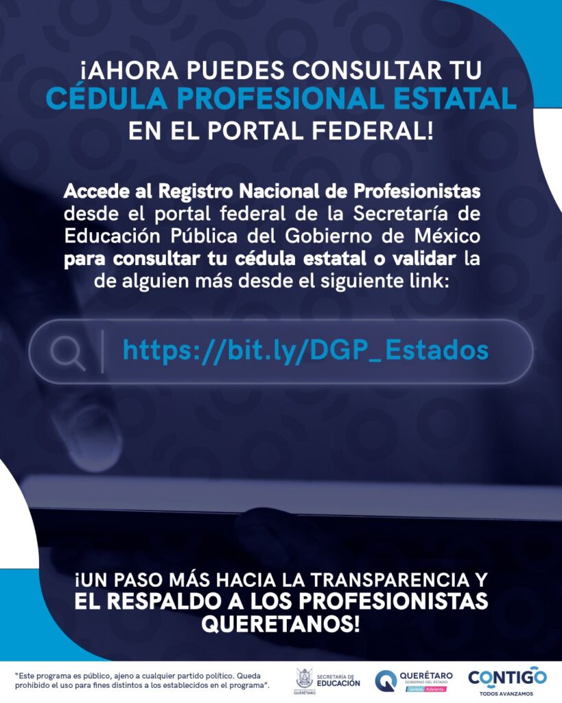 Para consultar este documento en línea puede ingresarse a alguno de los siguientes links: https://bit.ly/DGP_Estados, o https://cedulaprofesional.sep.gob.mx/cedula-profesional/Cedulas-Estatales; una vez en el portal, deberán seleccionar la entidad federativa donde se originó el documento e ingresar el número de identificación de Cédula. Actualmente, Querétaro forma parte de los siete Estados integrados al Registro Nacional junto con Aguascalientes, Chihuahua, Coahuila, Hidalgo, Michoacán y Sonora.