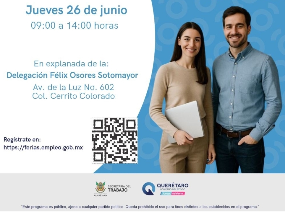 La Secretaría del Trabajo (ST), que encabeza Liliana San Martín Castillo, invita a la ciudadanía a participar en la Feria Nacional de Empleo Querétaro 2025, donde se ofertarán mil 182 vacantes. El evento se llevará a cabo el próximo 26 de junio en la explanada de la delegación Félix Osores Sotomayor, en Cerrito Colorado, de 9:00 a 14:00 horas.