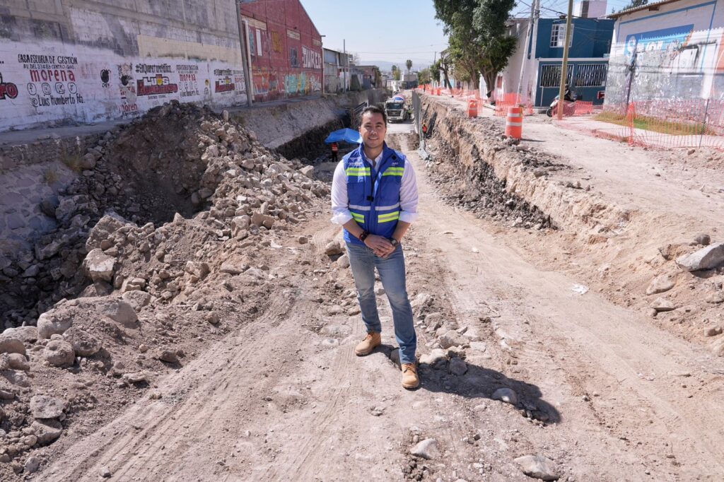 La obra contempla la construcción de un cajón pluvial de 120 metros, con dimensiones de 6.6 metros de ancho por 5.1 metros de alto; además de tres mil 427 metros de red de drenaje sanitario, 104 pozos de visita y 104 descargas domiciliarias, así como mil 393 metros de red de agua potable y 104 tomas domiciliarias.