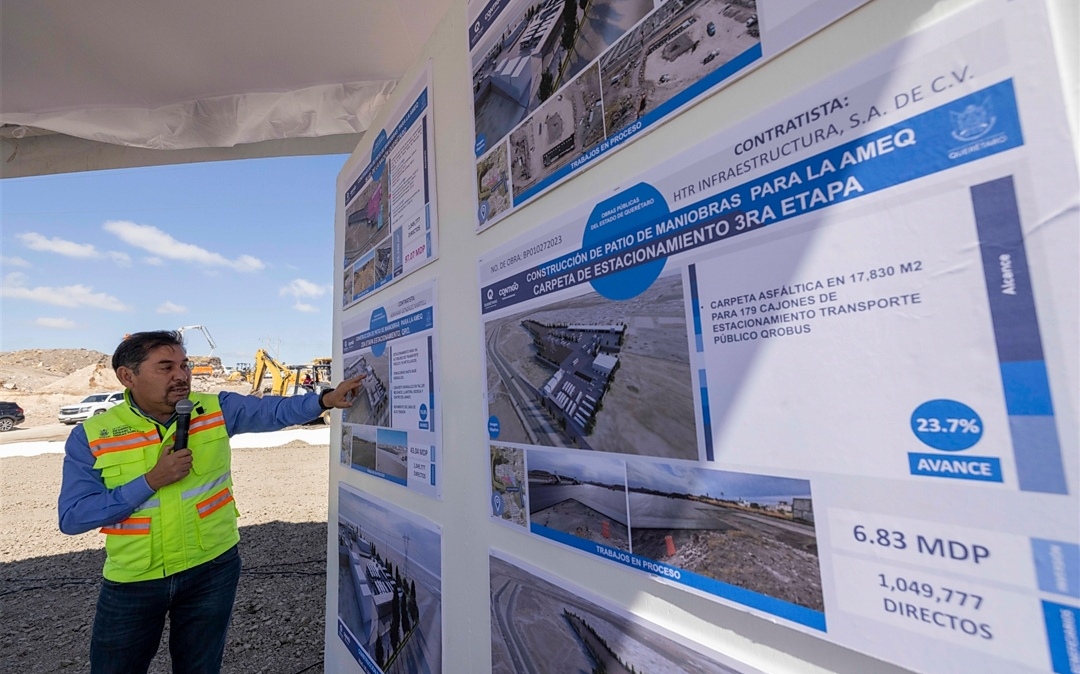 El gobernador, Mauricio Kuri González, supervisó los trabajos que se realizan en la construcción del patio de maniobras de la Agencia de Movilidad del Estado (AMEQ), infraestructura que registra un avance superior al 70 por ciento y que, mediante una inversión cercana a los 100 millones de pesos, se consolidará como un espacio seguro para el resguardo y mantenimiento de las unidades del transporte público Qrobus.